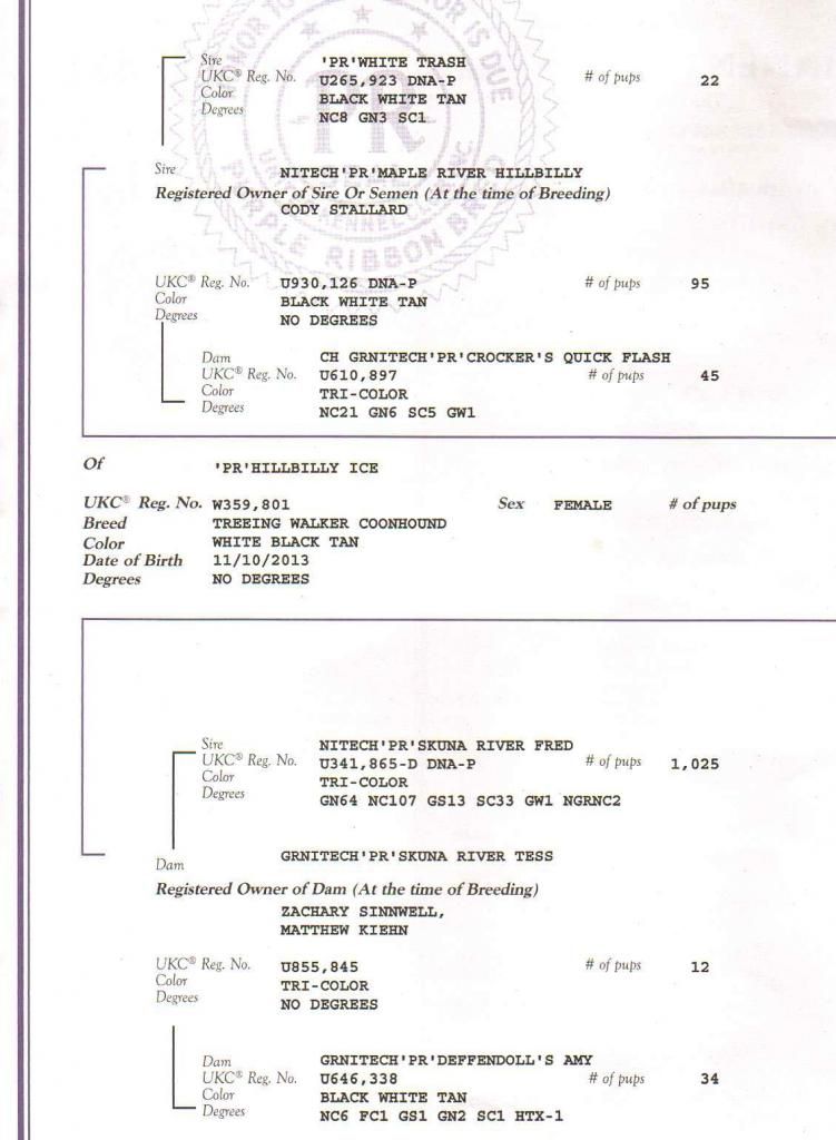 Sire Hillbilly Deluxe is a platinum champion and the dam is silver champion Skuna River Tess. Tess is a Grntch.
