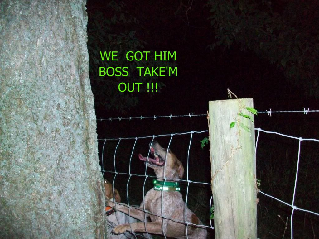 river bottoms with ol tymes and his son TJ then two dogs could not stay on the tree together with out fightin, so of course it was out of season, well the dogs got treeed so Eddie said pull down by the road and i will shoot this coon out so we did ,i give Eddie the rifle and he ran across the creek and shot the coon out,,,,