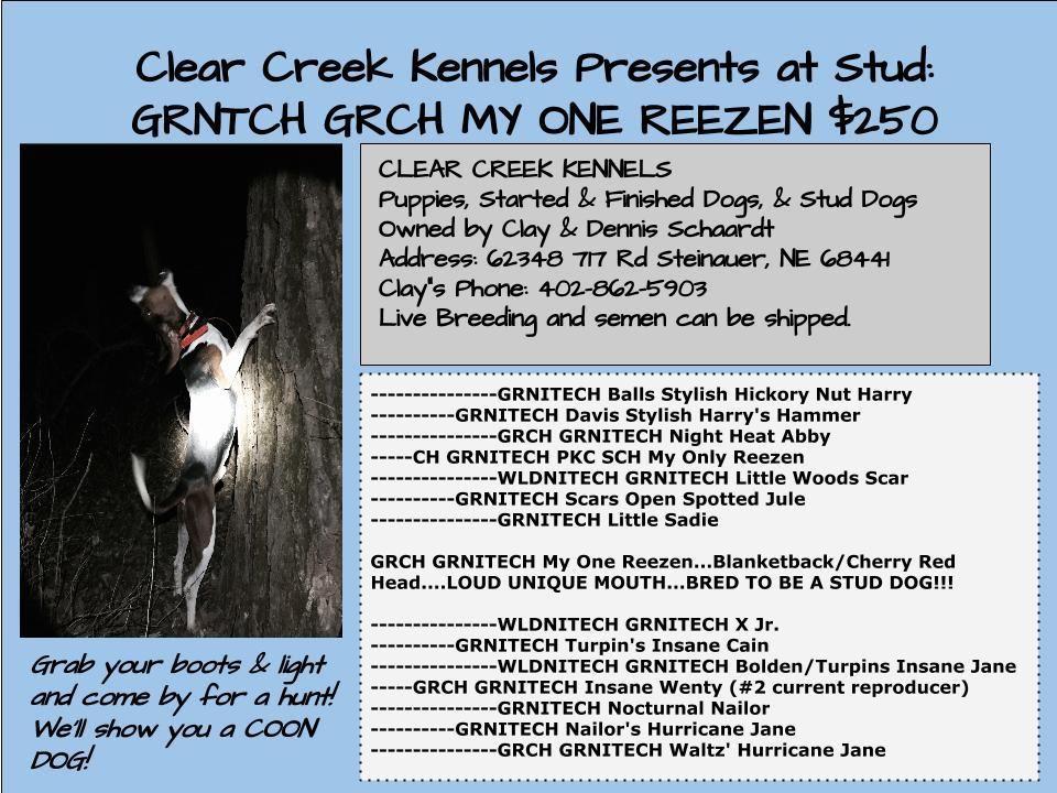 Reezen is a UKC GRNITECH GRCH with $114 won in pkc. He is a son to the famous GRNITECH GRCH PKC SCH THOMAS'S MY ONLY REEZEN. His momma is GRNITECH GRCH INSANE WENTY who is the current number 2 female reproducer. We call Reezen Little Reezen. He has a unique mouth. Bawl all the way. He's loud. Good Conformation and a good bite. He has no reverse. He also likes to be by himself. Cherry Red blanket back colored dog. He has been bred once and produced 5 pups that are scattered across the south. They are only 4 months old. He will be bred a lot within the next year. Prefer to breed him artificially for now, but will natural breed too. $250 for stud fee right now. I bought this dog from David Griner. Reezen is located in Southeast Nebraska in a town called Table Rock, Nebraska. Come for a hunt!