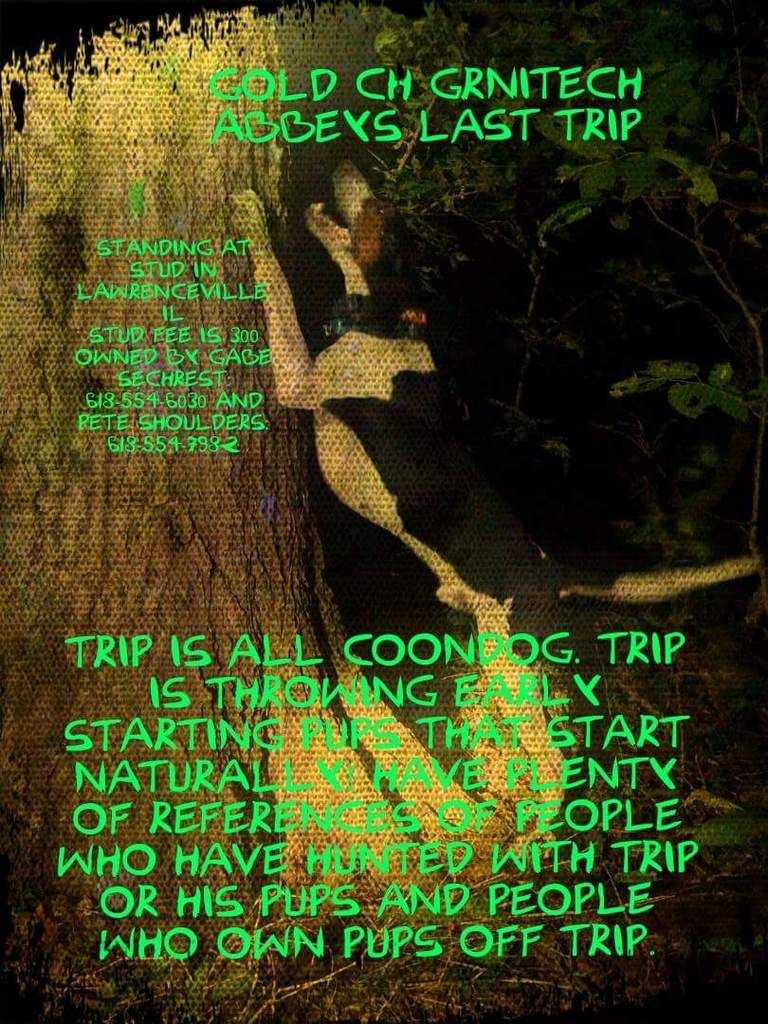 Trip had two pups get in the final four of 2015 fall baby stakes. One got 4th and the other won it. Also one got 2nd in the final four of the chkc little league hunt. He has some winners on ground with just a few litters. Wouldn't over look this dog when your female comes in heat