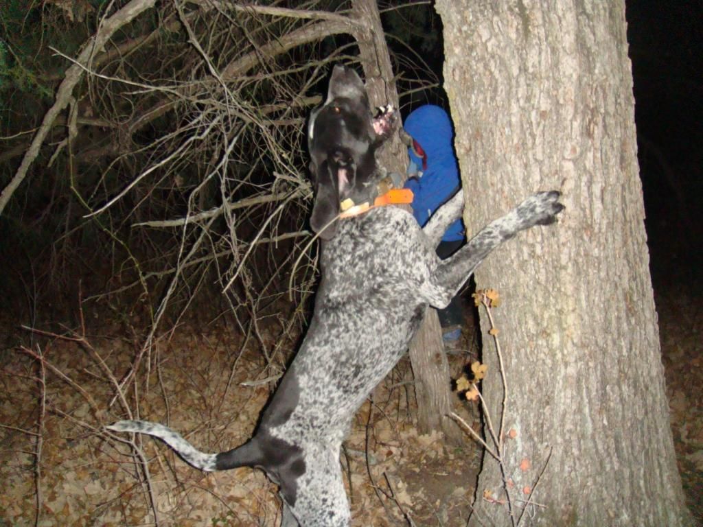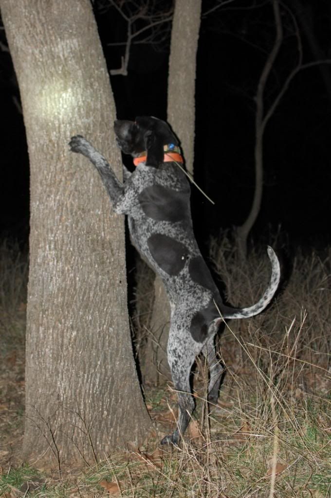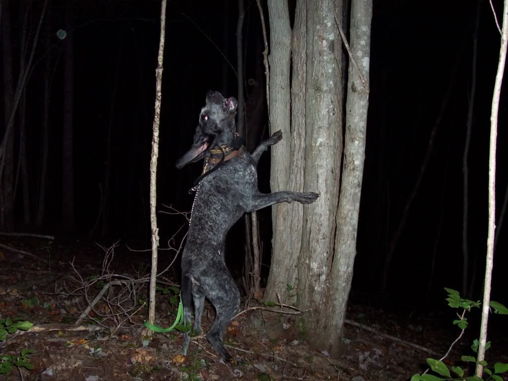 here is a couple of pictures of one of my hounds. in the one picture you will note that there is no lead on him tying him to the tree.. If you want to clear all doubt about staying treed bring your light and boots and I will show him.leave your dog fighters at home.