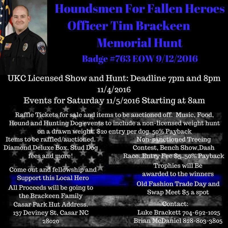 Hello fellow coon hunters will be hosting on November 4th and 5th 2016 in Casar NC a memorial hunt and all day event for our fallen heroes. All the proceeds from this event will go to the Brackeen family for the loss of their love one Tim Brackeen who lost his life in the act of duty. If anyone would like to make a donation or would like to donate anything like stud services, hunting supplies or anything else that we can raffle off to raise money to support this loving family please contact the below. Thank you so much for your support!!!