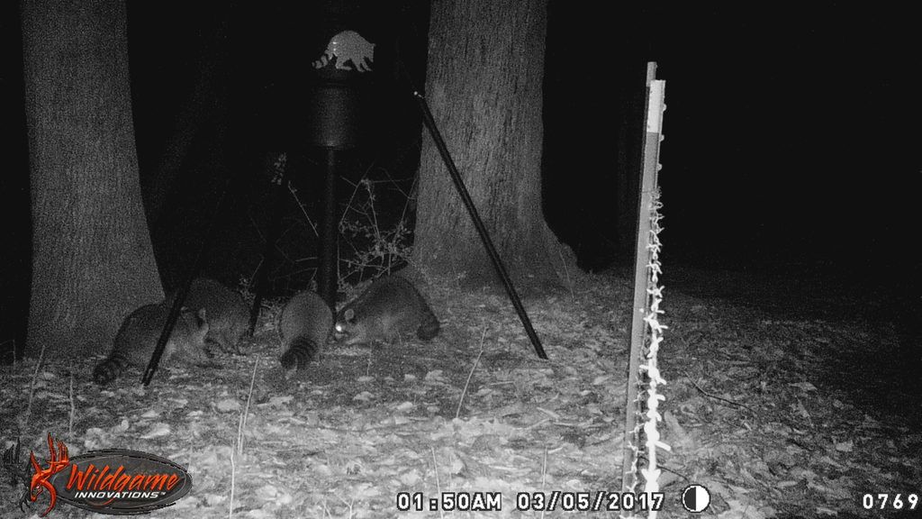 Here's one of my feeders,its about 8ft off the ground(to keep the cattle and deer out). They hold about 3-4 hundred lbs of feed and have a place for a trap.