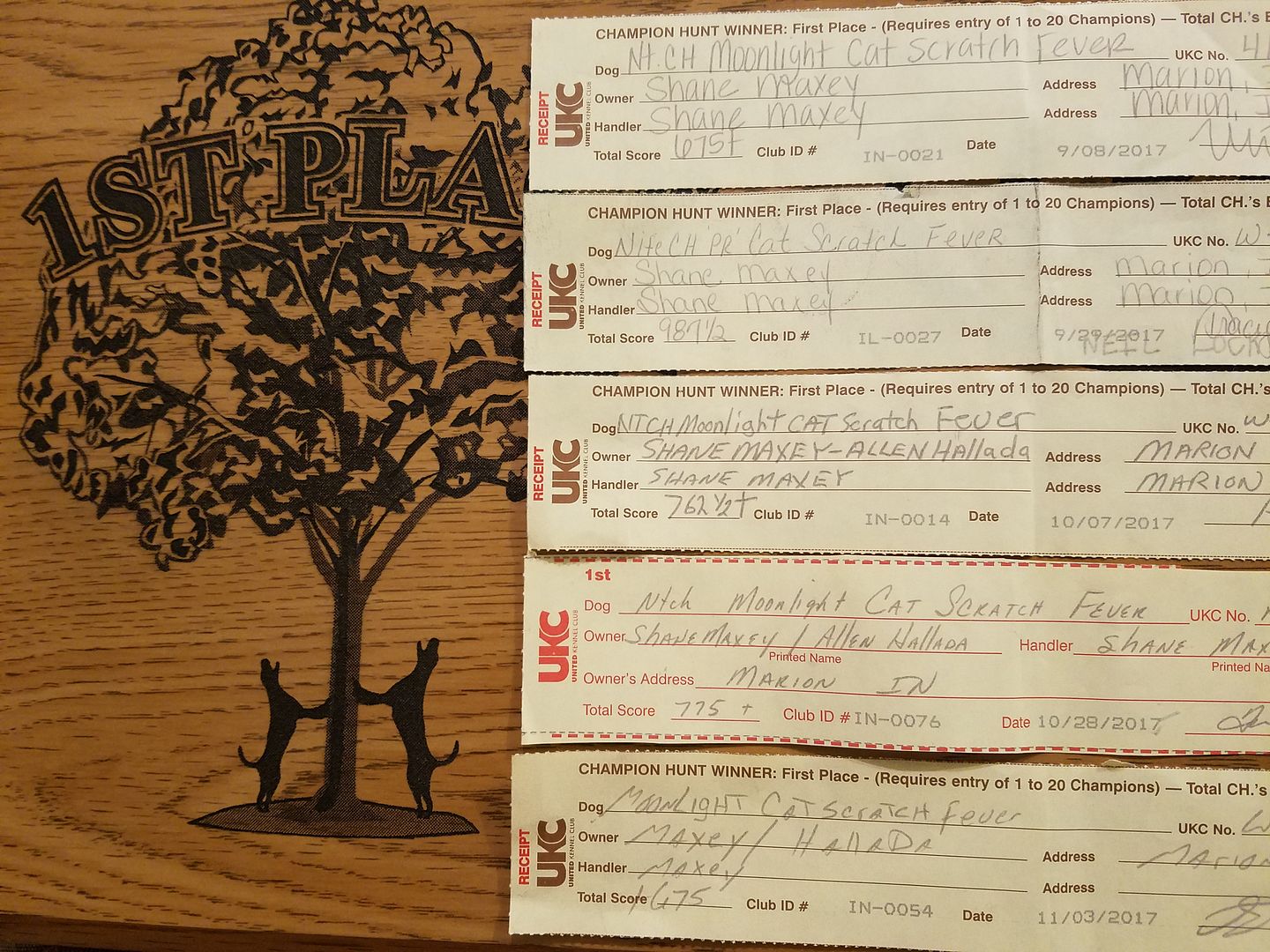 These are her 5 Nt.Ch. win slips. 7 weeks from start to finish with a total point count of 3875 plus points. But that not the whole story...