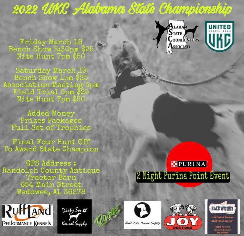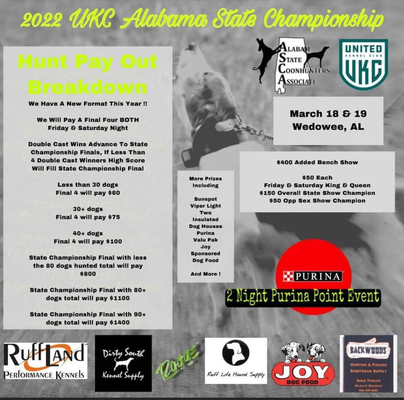UKC Forums : Powered by vBulletin version 2.3.0 UKC Forums > Departments > UKC Coonhounds > 2022 Alabama State Championship with results
