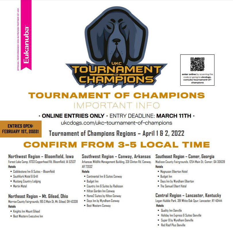 Reminder: DEADLINE TO CONFIRM YOUR ENTRY IS 5PM LOCAL TIME ON BOTH FRIDAY AND SATURDAY AT THE REGIONS. Give yourself plenty of time, and get checked in with the Master of Hounds. There is no exception for these deadlines, the dog has to be confirmed before the clock strikes 5 PM at your region.