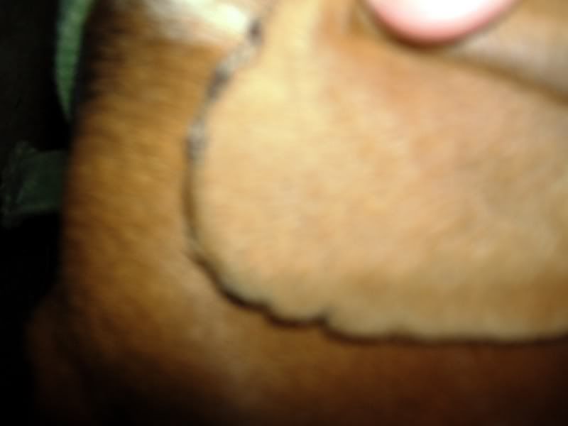 Not sure how it started, but every time he shook his head the cracks opened up and started bleeding and getting worse. We couldn't find why he was shaking his head so much to begin with, so we treated him for mites, scabies/mange, with antibiotic cream, with anti-fungal stuff. The vet gave him heavy-duty shots of Ivermec all summer, and we massaged with a 3-way cream.