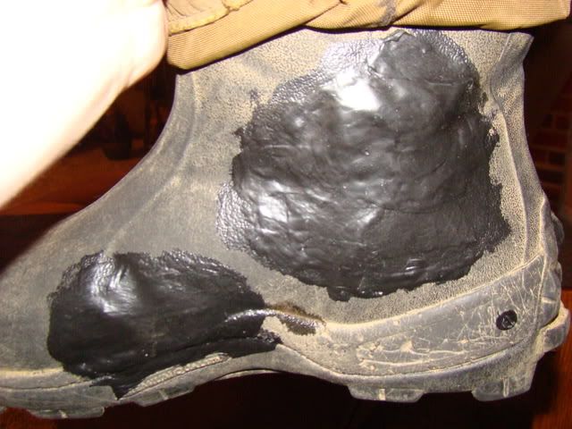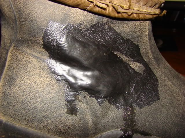 I am trying Liquid tape on an old pair of Mucks tonight I got it at Walmart in the auto section by the electrical fuses. Its original use is for insulating wire conections in marine and outdoor situations. I rubber taped the hole and applied a bunch of even coats letting them dry in between, It has made a nice thick rubber layer. Hopefully this will allow me to use these boots for a back up pair now without getting my feet wet.