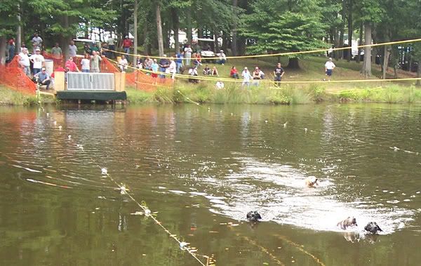 This is from an NPHA Water Race. The starting box is in the background. Note side boundary markers as dogs swim toward suspended line marker.