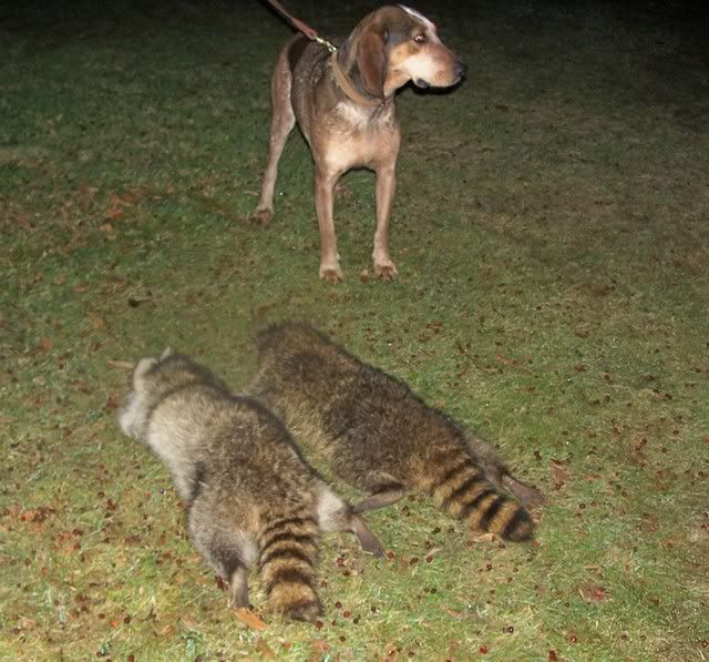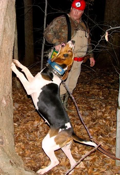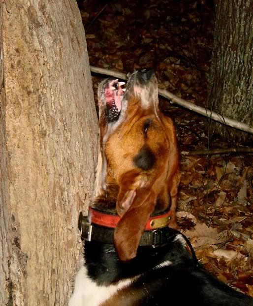 dogs tracked one out into the beaver pond crossing on logs. Treed on an old dead hollow tree. on the way back I fell off the log and over my chaps. Still a crust of ice about 3 incehs below the surface of the water. My male fell through but luckily it was thin enough he broke his way to a log. Then, treed another den tree. Then a grinner (Tri-tronics got a workout on that one). The two dogs I was hunting tonight are still young and a little trashy once in awhile.