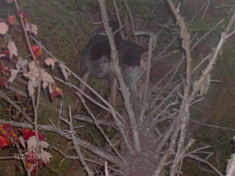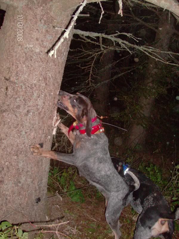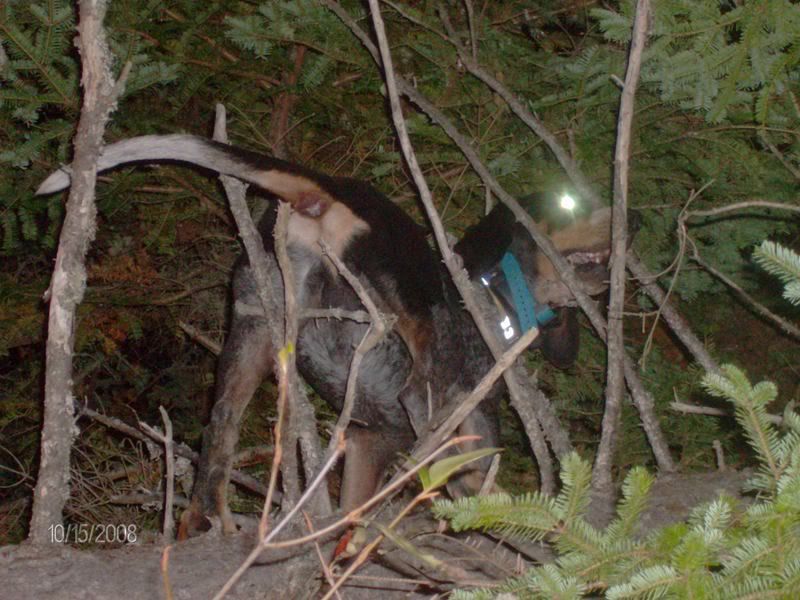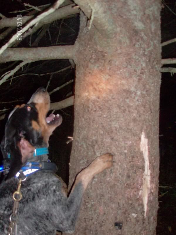 I finally went out by myself tonite ... with the hunt coming up this weekend I want to get Prancer out as much as possible. Went and made one drop, didn't take him long to get struck and treed. I knew there was something funky going on by the way he was treeing got in there and he was treed "in" a leaner. Took some coaxing but I got him out thankfully safe.