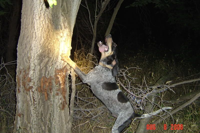 I cut him loose down one creek, and he hunted about 40 minutes without getting a strike. When he finally came in I went to another place and cut him. He finally found a track there, but it was an old rough one. He hammered on it until he finally jumped the coon, and got him treed after a nice race through some thick briars.