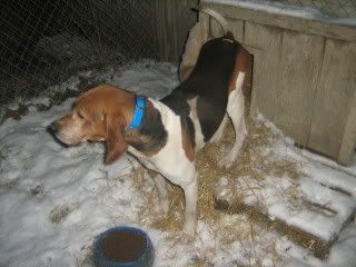 as everyone knows my other half has a thing for walkers grr the w word hehe just kidding well recently he showed up at my work with a hound . course he knew I wouldnt tell him no so now we have a 4th walker in our kennels my blue dogs are looking at me funny they thought I was crazy when I got a Plott now daddy brings home another Walker well i just thought i would share some pics of the ole boy he does have some nice breeding though i will admit and if anyone can help me find pictures of the dogs in his pedigree i would approicate it John wants to know what they looked like .