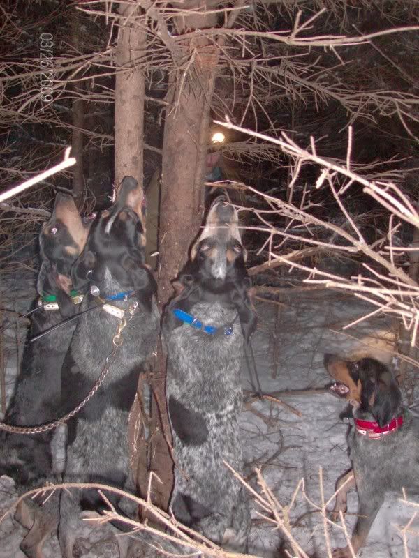 Got the dogs out last nite for the first time this week. Took my fathers two, Posh & Jack and my hunting buddies two dogs, Skye & Tommy. Treed a quick one with all four of them, re-cut them back in the 3 young dogs got struck and run towards the road so we picked em up. Posh ended up gettin under another coon.