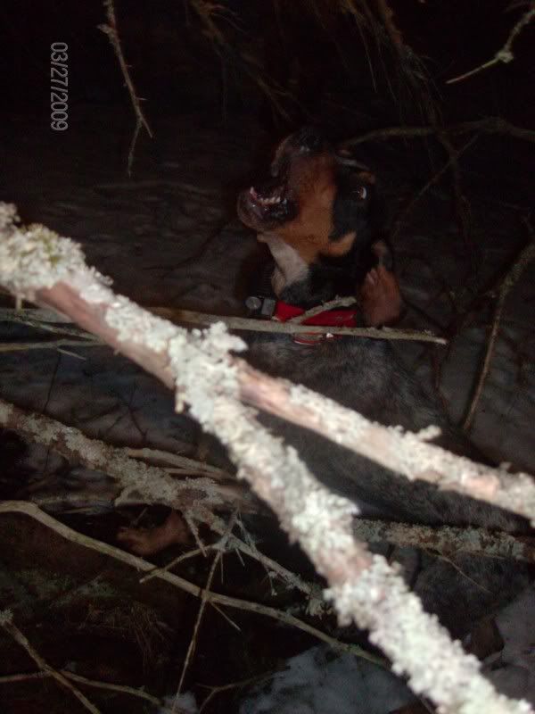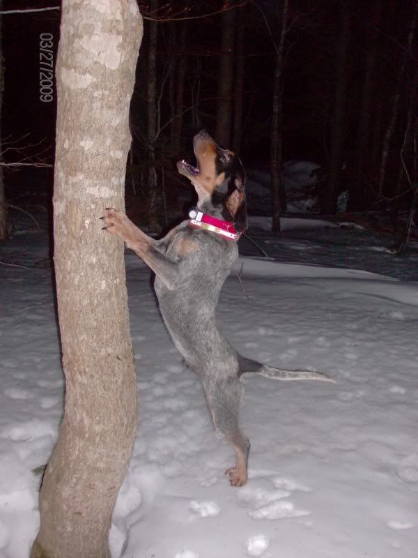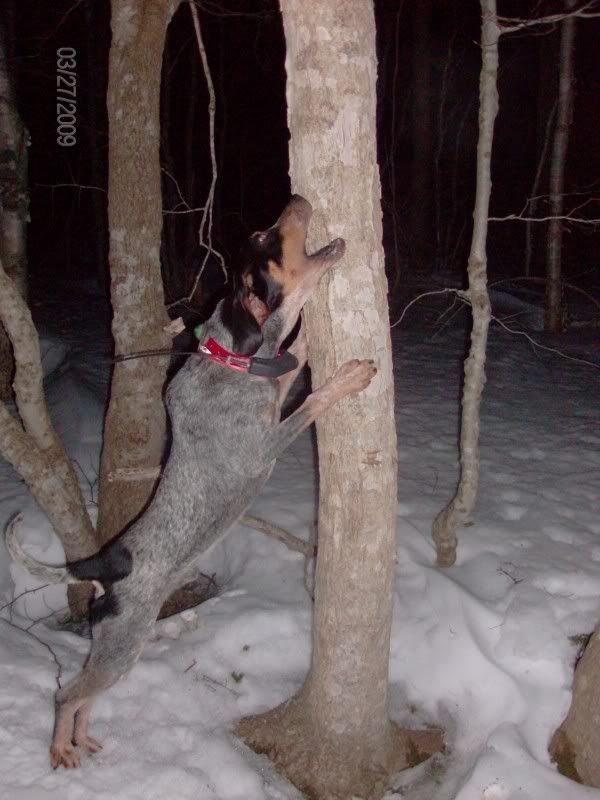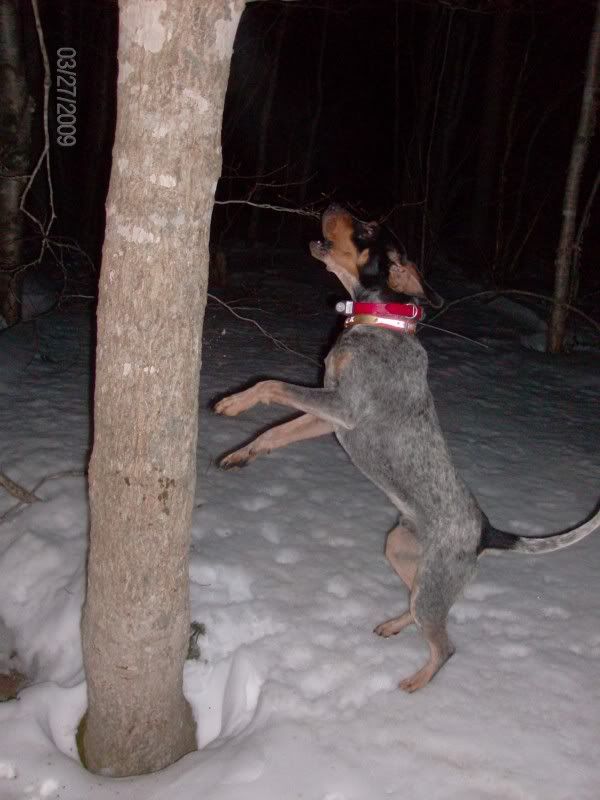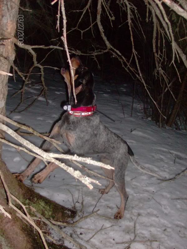 Tonite we took Jack out by himself. Made 3 drops and treed 2. First drop he started a colder tracker warmed it up and treed it. Next one he got struck on a hot track and got it treed. Last drop he got struck but we ended up picking him up.