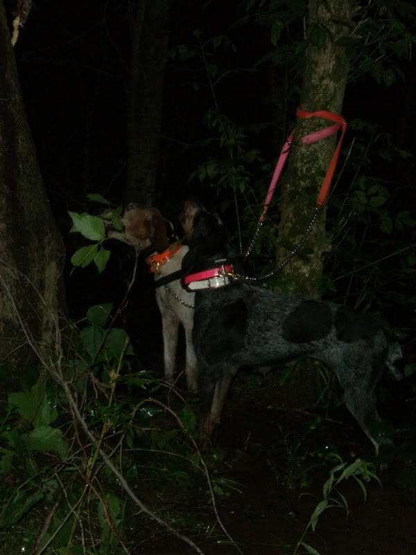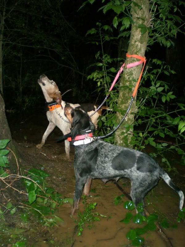 Well, last night we went and they decided NOT to tree on a bucket again haha. It had been raining most of the day, and the bottoms we were hunting in had a good bit of water standing in them. My blue dog struck a track pretty quickly that she drove hard and fast for a little bit, but for some reason or another she decided to drop it. The Walker moved around on several tracks before they both treed on the side of a hill where there were several VERY thick, tall trees right together. We looked for about 20 minutes and never saw the coon, but it was a pretty convincing tree. It's just so hard to check a dog's accuracy down here this time of year. The leaves are so thick on most of the trees that it would be a small miracle to spot the coon unless you had about 5 sets of eyes.