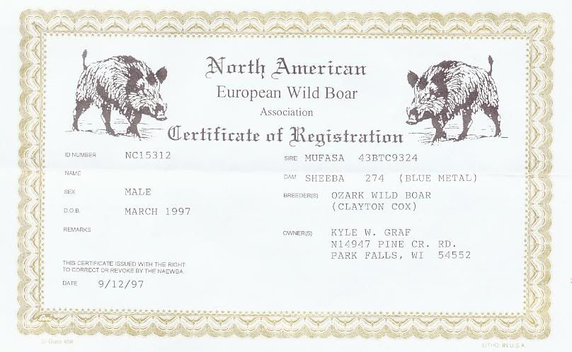 He is a registered pure bred European Wild Boar. He is a zoo quality animal. He never gets used for starting pups. I just keep him because I think he is cool.