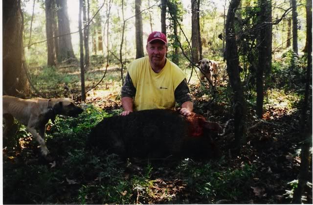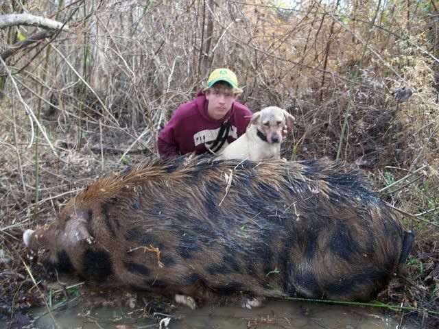 I wasn't on this hunt but my hunting buddy was, an this kid we had been taking with us since he was about 10? in the picture he's 17 or so? Well they had put dogs out in two differant locations an this young mans dogs bayed this hog, my hunting buddy an his pal went to there dogs bayed an left this young feller to go to this hog not knowing it was this good! Well when E-Man gets there his two cur dogs one of which (in the picture) was bred an raised on my yard had this brute bayed up. Without a second of fear he sent his bulldog to catch an went in after to throw the hog an tie it. Well the hog wasn't having it an killed the bulldog DEAD! Well E-Man not wanting to loose such a good hog "talked" these two young cur dogs into catching this big ole hog an holding long enough so he could get it tossed an cuffed.