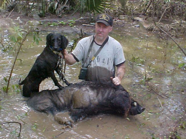 But for what your wanting to do your gonna need to scout hard for them hogs, they can an will make deer look retarded. There nose is better there ears better eyes are a weak spot. They don't just run swampy area's but do prefer to remain close to water an thick, thick, nasty places, or thick hedge rows. A good feed is soured corn with vanilla extract poured on it ... if ya find a water hole mud waller type spot the hogs are using dump the corn in it as being under water will keep the deer an tree rats from eating it first. Water an sour want bother a hog none, they out swim Labs. LMAO Also if ya can find a spot a little burnt motor oil goes a long way, hogs love to waller in it as it keeps the insects off them an kills the ones on them. But watch out for the EPA ! LOL Hope this helps some .... here's a picture of a pair of my cur dogs working about a 150 pound boar, older picture not recent but gives ya an idea of what they like to hide in?