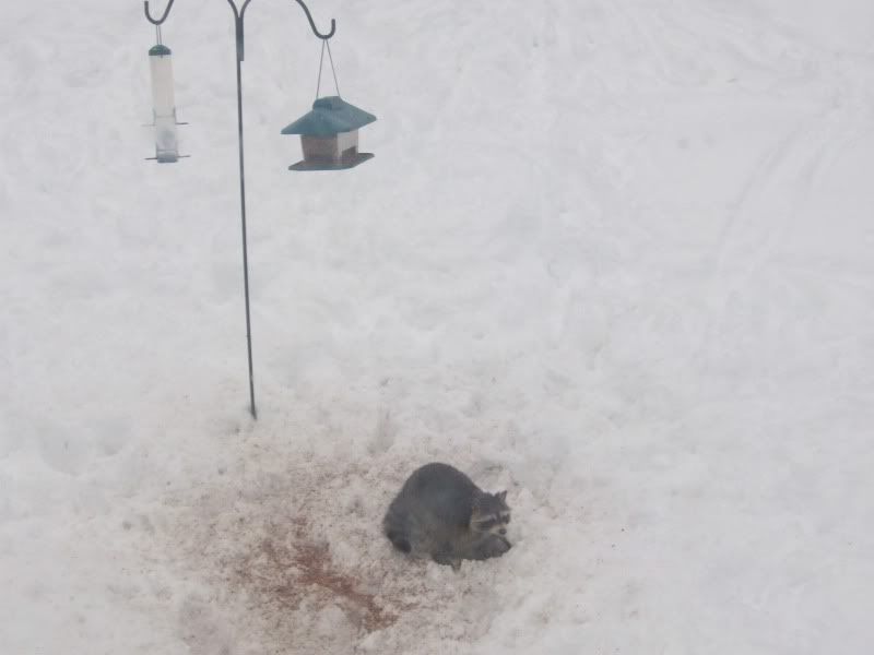 Ohh I know I'm not upset about them ---- just bird feed just thought it was kinda cool they are less then 10 feet from my house with a barking dog inside and a 4 year old yelling at them the coon could care less he stayed till he was full. Can't see it in the picture but when he turned you could see his hip bones he was so skinny. I hate to see an animal suffer but times like these sort out good and bad genetics natures way of culling.