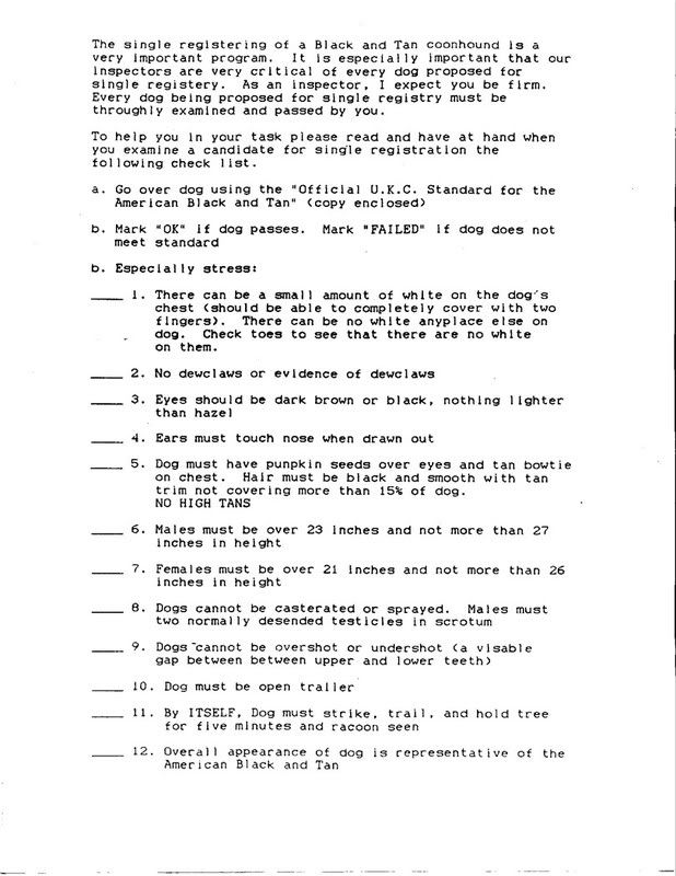 For example, one of the more famous requirements pertaining only to single registration is that the dog must go hunting, run and tree a coon by itself in the presence of an inspector. Here is a document that has been used by B&T breed inspectors in the past: