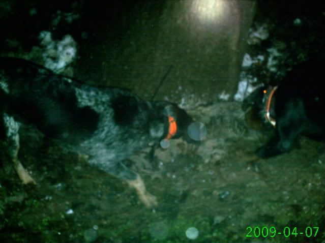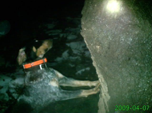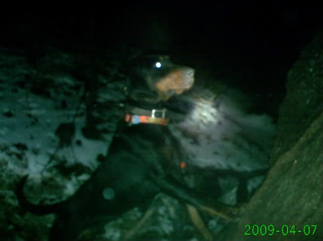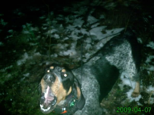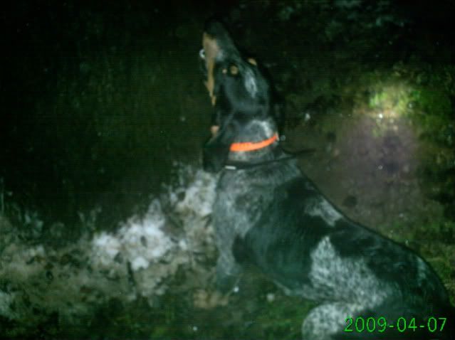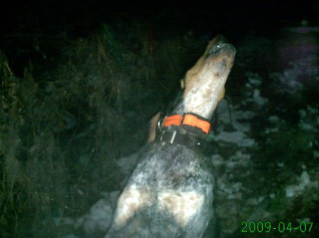 I just noticed the date on the camera was messed up. Should had been 2-5-2010 . Here is a few pic's of my 7 month old Northern Blue Son X Bl. Moon Riseing Smokey River Sassy pup. He started early and is doing real well. I started hunting him by himself a while back but the weather is so wet and can't make many dumps so I am just running them together part of the time. They don't wind up on the same tree a lot but did on this one.