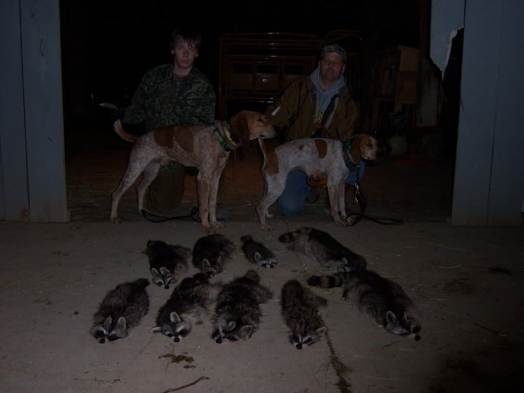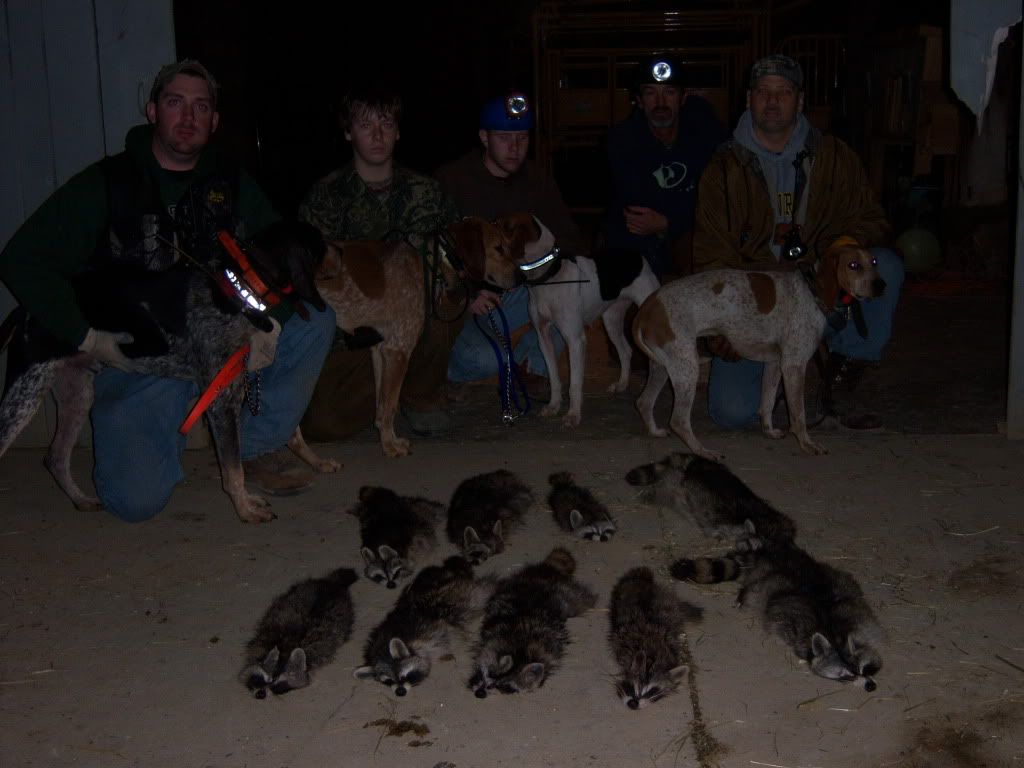 We took a Trip to Eastern Ohio this past weekend and a real good time. We Hunted 12 hours total between Friday and Saturday nights had a total of 13 trees killed 9 coons, 2 slick trees, and 2 den trees. All of the dogs did really good and made everybody proud that hunted with us. We stayed with some really nice people that treated us great and couldnt ask for any better people to meet.