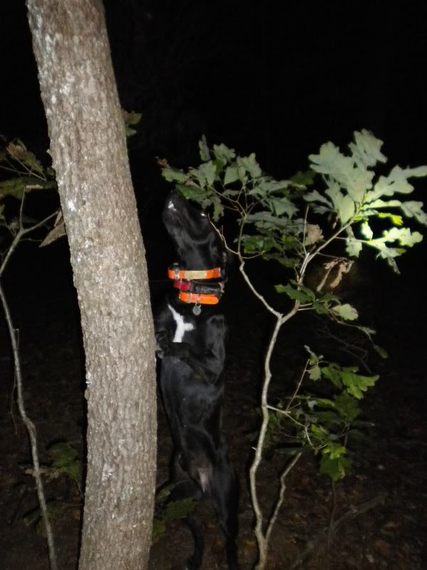 Got off that and didn't go 50 yards and he hit a track. I was afraid it was a grinner feeding on that carcass but it wasn't. He smoked this coon through some pretty rough swamp and put him up on a ridge. It went up a small tree but it grew up in the canopy of a large oak that branched off into 3 trees. Hard as I tried I couldn't find the coon. I would bet the farm it was up there the way he acted but luck wasn't with us on getting it out.