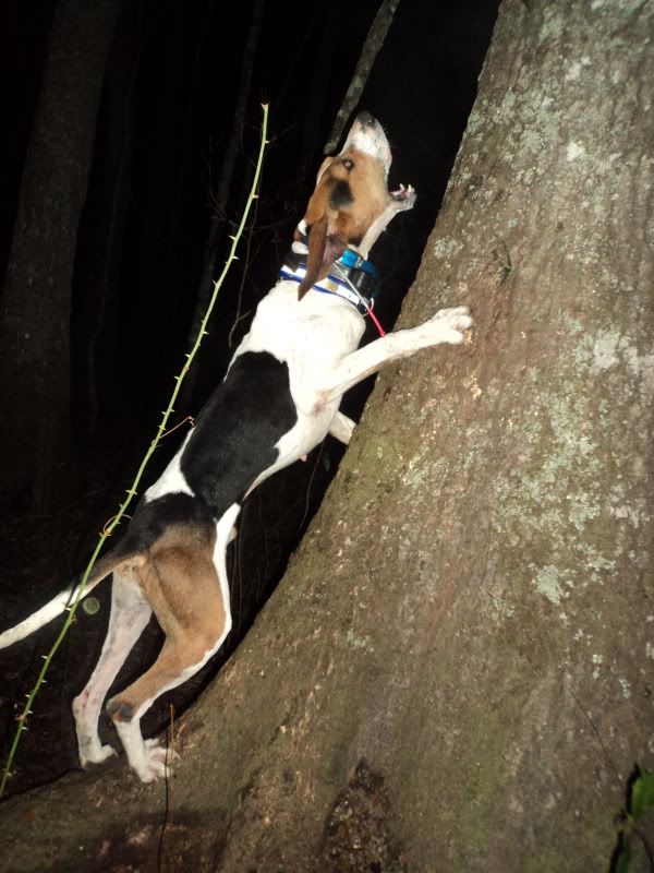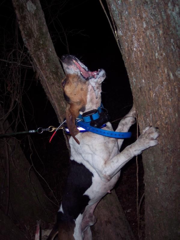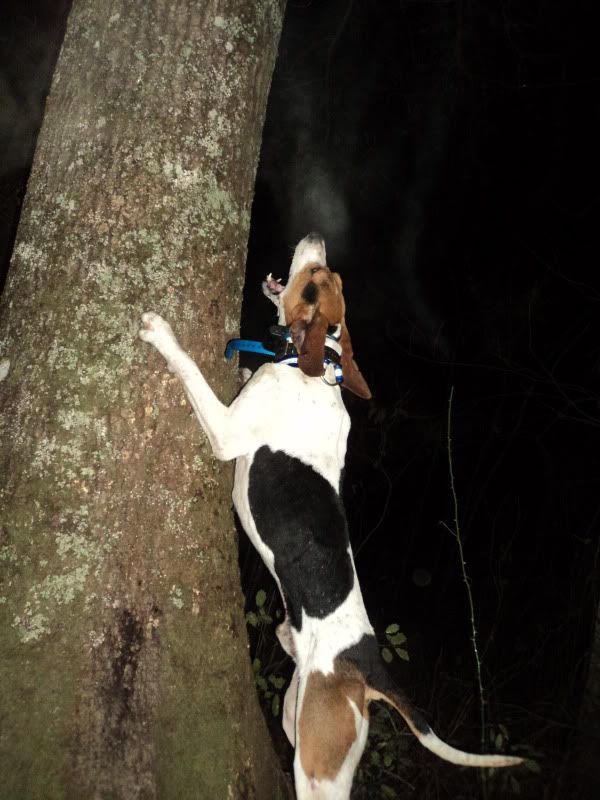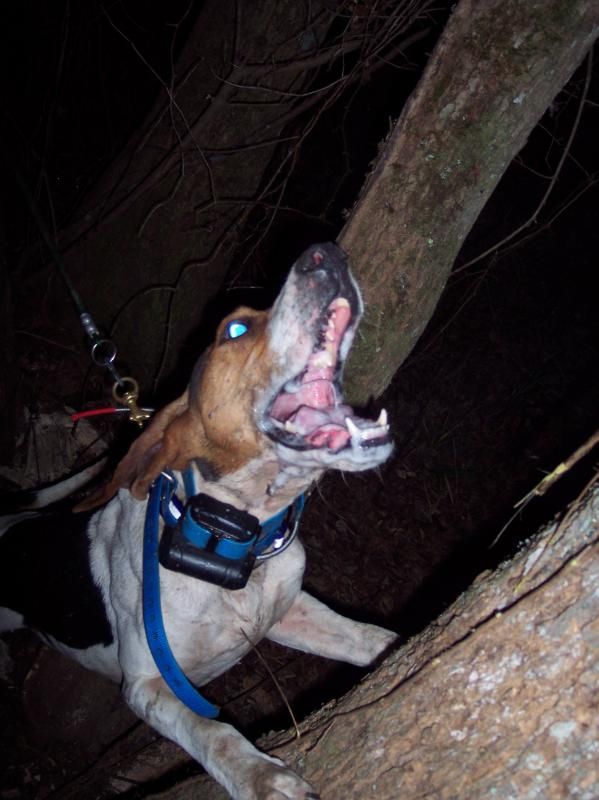 Smoke is a 3rd-4th strike dog and is a 1st treedog. He will tree 1st just about 9 out of 10 times. He loves to split and get off to hisself. Smoke is very accurate 70% and a little better. Thin coon or thick coon he is the same. He runs track with a bawl mouth. He will drift a track , wind or tree lay up coons. Never seen a track too tuff for this ol boy. Water is NO PROBLEM he will push a track threw it and put the meat at the end of it. He throws two bawling locates and turns over to a bawl and chop on the tree. Smoke is no 120-130bpm tree dog he is a 80-90 bpm tree dog and he is very clean very classy tree dog NO JUMPING ,,, NO JACKING ,,, Strait up on the hardwood with those toe nails planted. He has a really good mouth , I would give him a 8 out of 1-10. He is not ill in no way. Every cast we have entered smoke in we had nothing but good compliments , every body liked how he got by himself and how accurate he was. If you have drawed out with Smoke feel free to post GOOD or BAD. We have nothing to hide. We will cut him any night which he gets hunted regular. Give us a call and bring your boots ... lights ... and measuring stick and lets go COON HUNTING!!!! Thanks for reading!!