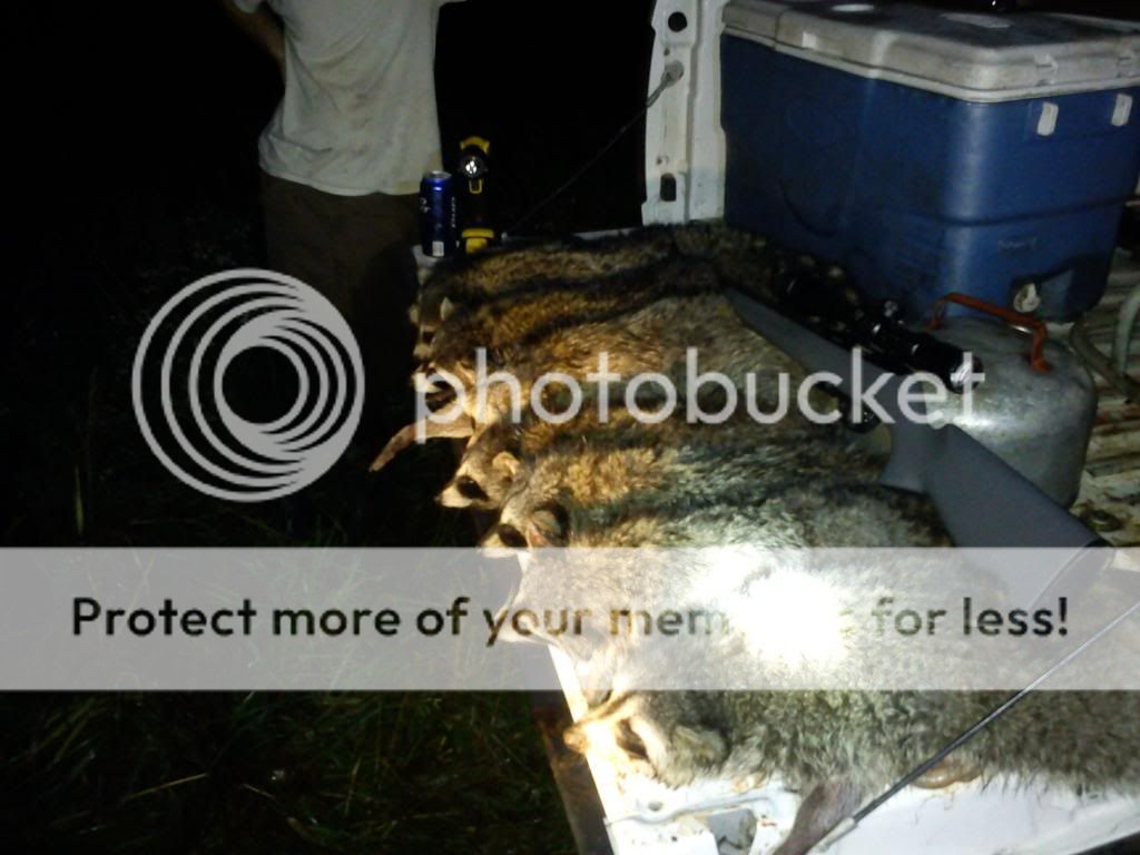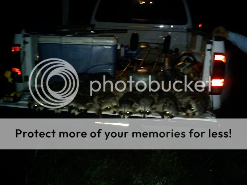 Went to a farm we have been holding out all year on waiting for kill season. The man who owns it feeds grain to cattle and been having terrible problems with coons. We helped the situation. Before any body gets carried away the man specifically told us to exterminate the coons or we were not allowed back so don't want to hear everybody crying about knocking too many out. For those of you that like to COONHUNT Enjoy!!!