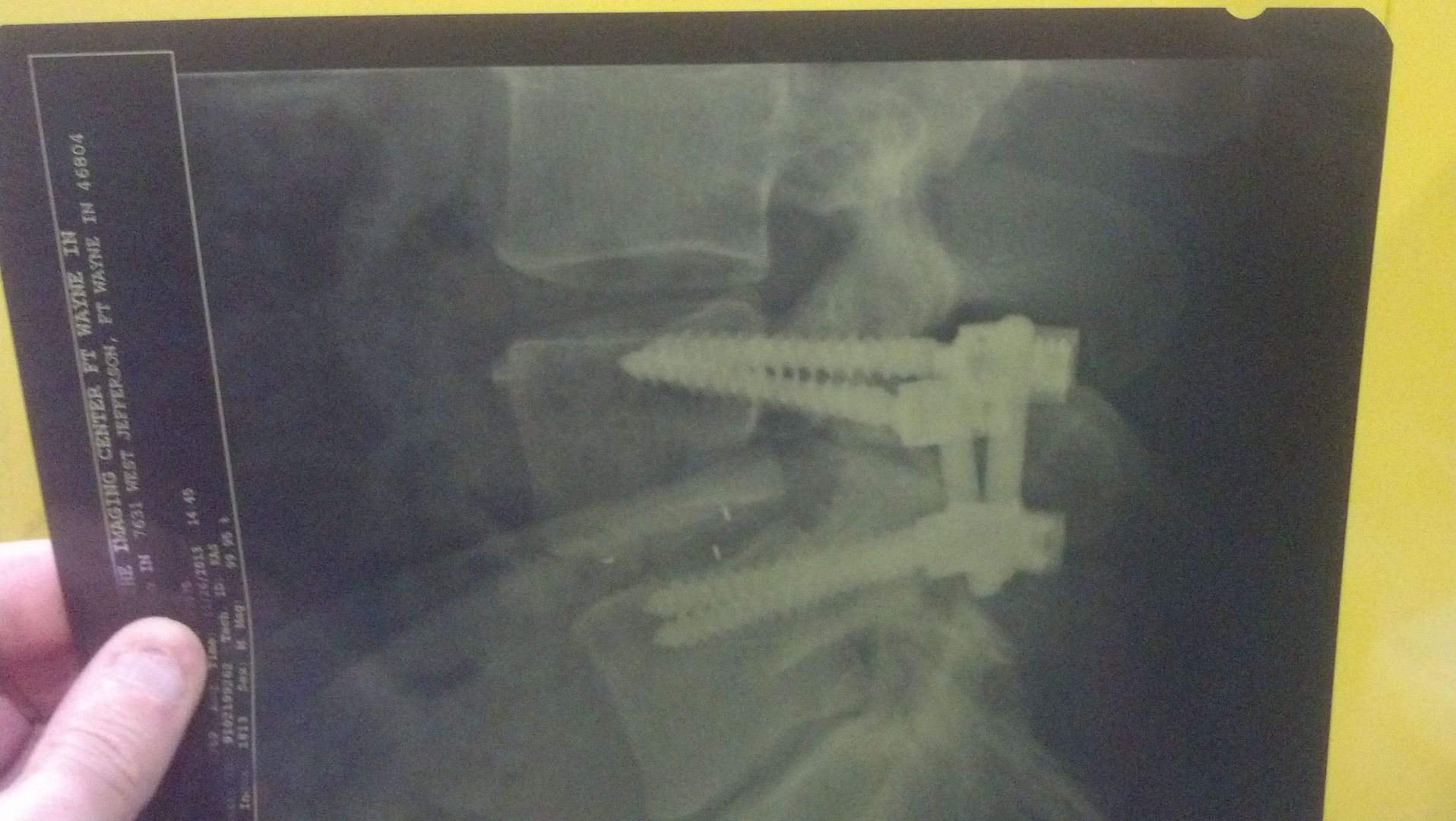 Then last summer I suffered a serious injury at work and just before I was due to have surgery....I was in a bad wreck that totaled my truck. In October I underwent a surgery on my left hand followed by a surgery to my back in which they had to go in and partially remove two ruptured discs and totally remove another and fuse two of my vertebra together. They put a plastic disc in between the two vertebra and injected some cadaver bone marrow and then screwed everything together with titanium screws, rods and ball socket locking devices to hold everything in place till the bone grew together between the two vertebra.