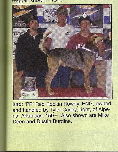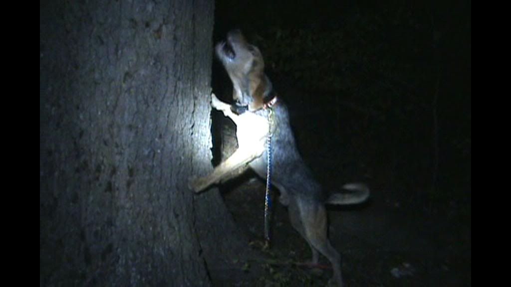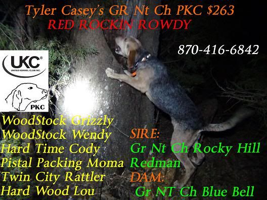 Rowdy is a tough hard going dog that will go the distance to get a coon treed. He is an honest strike usually taking second or third with honest company. Rowdy is almost always a first tree dog and will be by himself the majority of the time. He has a loud bawl on track and comes on a tree with two dying locates and rolls over to a steady 100 to 110 bpm. He is a slobber mouthed classy tree dog who will stay treed all night and is not ill or doesn't jack the tree.