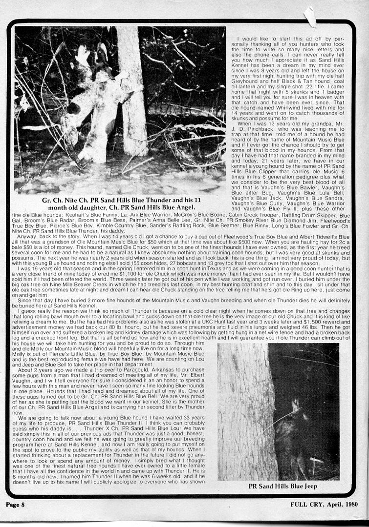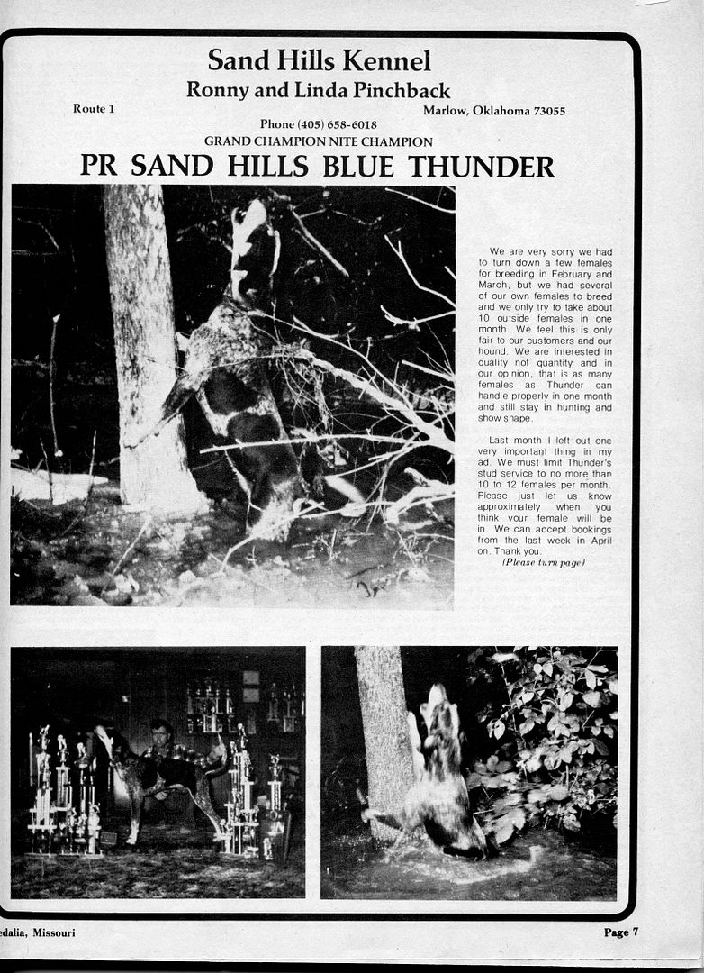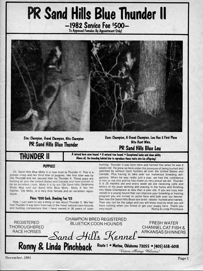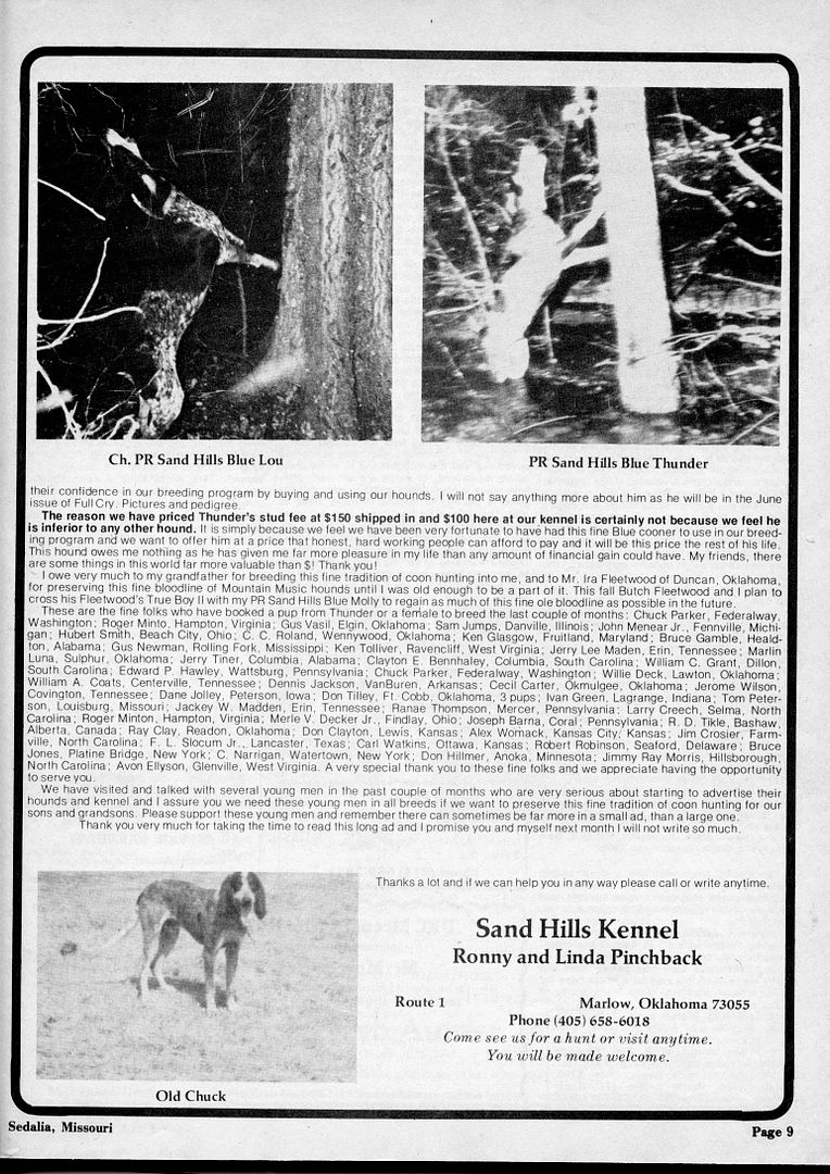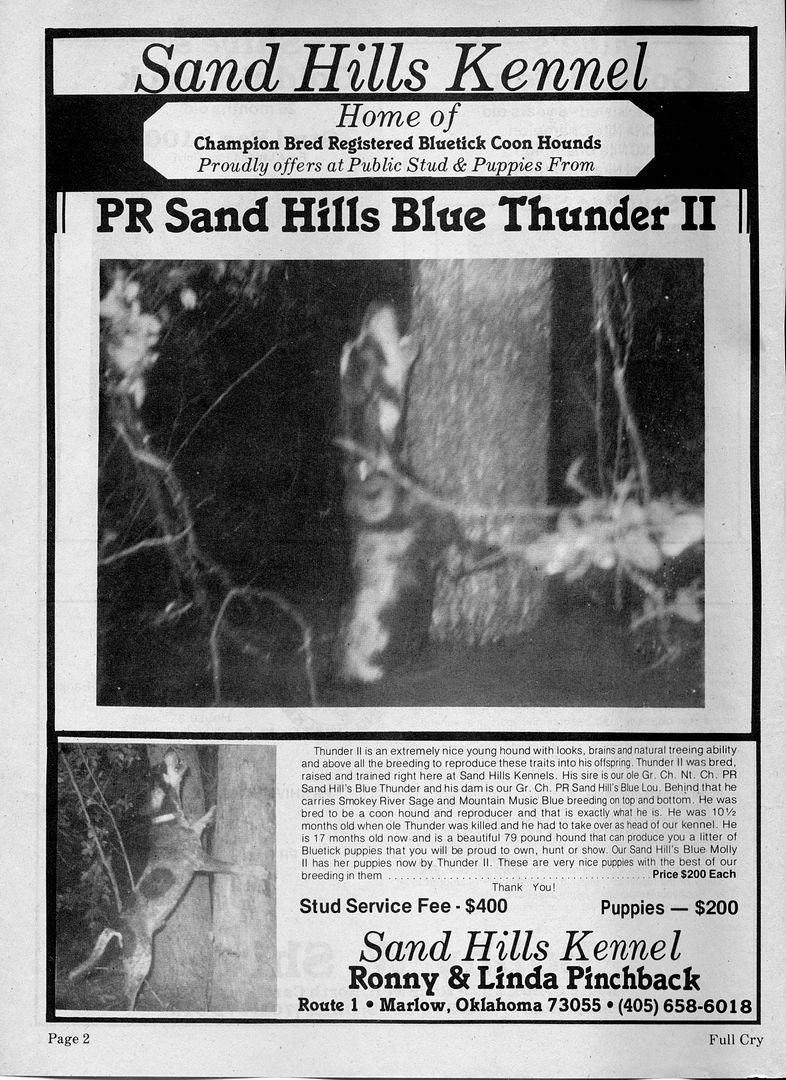 Driftwoodblue, thank you for posting the pictures. I started coon hunting regularly in 1979, & subscribed to the Full Cry Magazine in early 1980. Believe it or not, those Sand Hills Kennel ads are what made me want to hunt Blueticks. I don't know what it was, but when I saw those pictures, I made up my mind I was gonna try to have a decent blue dog one day. My memory did not tie Ronny & Sand Hills Kennels together until you posted those old ads. One could say Ronny had a lasting effect on a 15 year old Yankee boy he had never met!