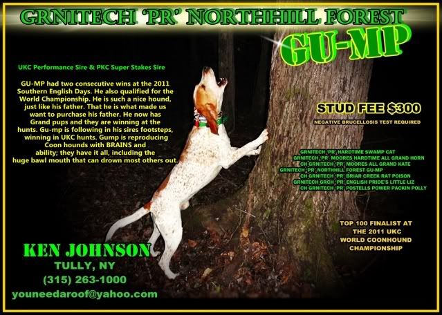 Freddy GUMP is not offered for sale I just like to keep him in front of the form and he has pups that will be at SEWD,of course the supply is limited because a lot was sold ahead of time.Gump should go to the high reproducers list with his dad soon,It will be something to have father and son on the list at the same time,Yes I still hunt gump,We love to hear him and see him make a track to the wood the way he does it in style.We don't hunt his dad much because of his age.Gump still acts like he's 4 years old.Gump is reproducing good solid coon dogs Huge solid big mouths and great track dogs,We are now crossing gump with Sargents Blue and Lumis,It has taken awhile but its starting to come together.This year should start showing the results.