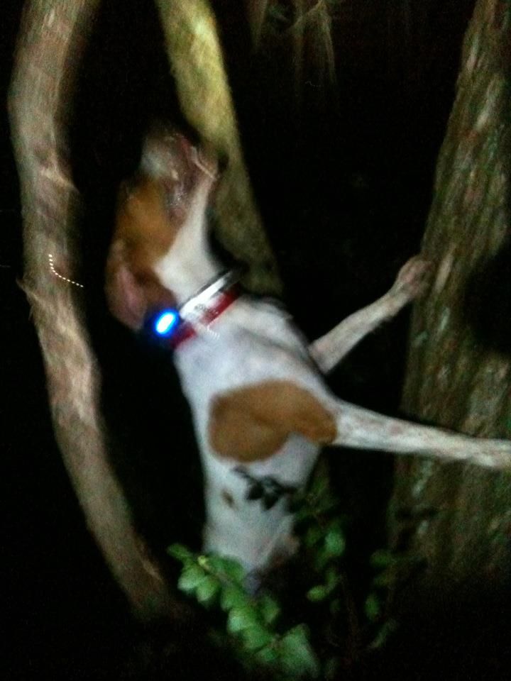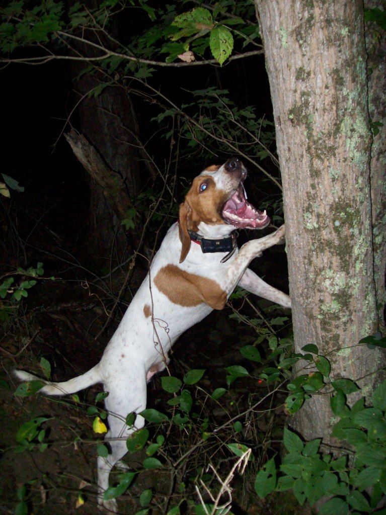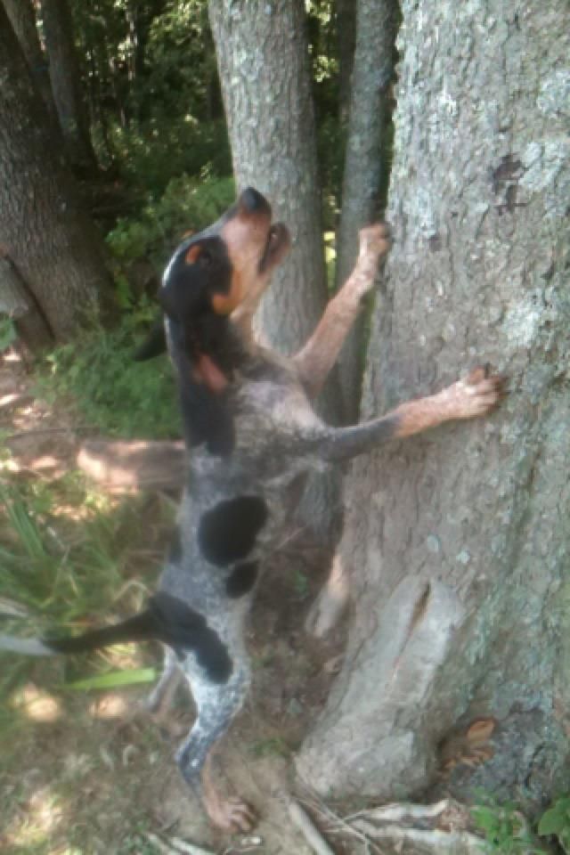 Feltner's 'PR' Hardtime Goober at 3 month old treeing up on a hide lol.