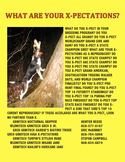 There are many different factors that can go into this argument. CAIN and X Both seem to be reproducing well in their own aspects. But you can't argue these two when there's also exy, insane x, and tall timber little x. That's 5 brothers at stud off arguably the best cross of all time. So many factors come into play. By numbers exy is reproducing the best out of all of them. There is a big discretion on the quality of females that have been bred to each. In my opinion both seem to be dominating reproducers of specific traits. So to me it's not an argument based on which is a better reproducer. Yet it is an argument upon which stud is reproducing a high percent of the style of hound that one is looking for. I'm sure Mr. Turpin will answer any questions about CAIN pups. I will answer any questions on X pups that any has. I also can give out several numbers of people that own x pups. Rather than arguing which one is a better reproducer, I beleive that we should all take into consideration the tremednous influence this cross has had on the breed. In saying this I am also speaking for the great reproducing females off this cross. The X JR. x JANE cross will be the talked about cross such as the Harry x Abby, Harry x Witch, Rebel x Jodie, Sackett Jr. x Dixie, etc. for the next 10, 20, 30 years!