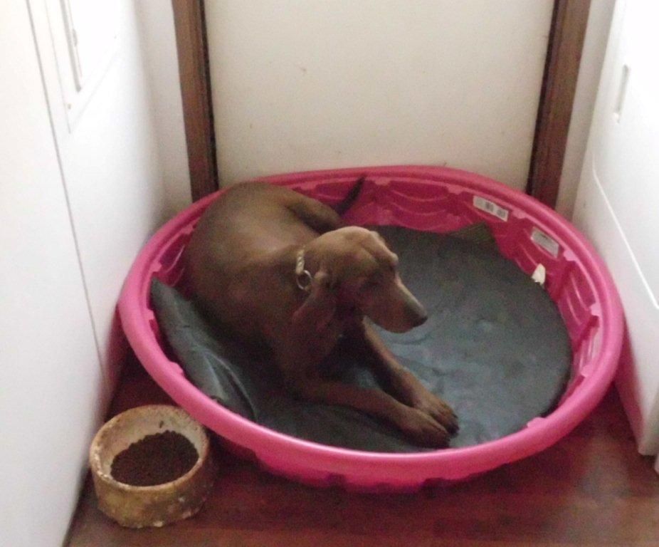 I too use the kids pool. Put a 5' x10' kennel in the shed. Have a dog door with outside kennel so she can go out when she wants. We put an electric blanket under the pool to help keep the pups warm