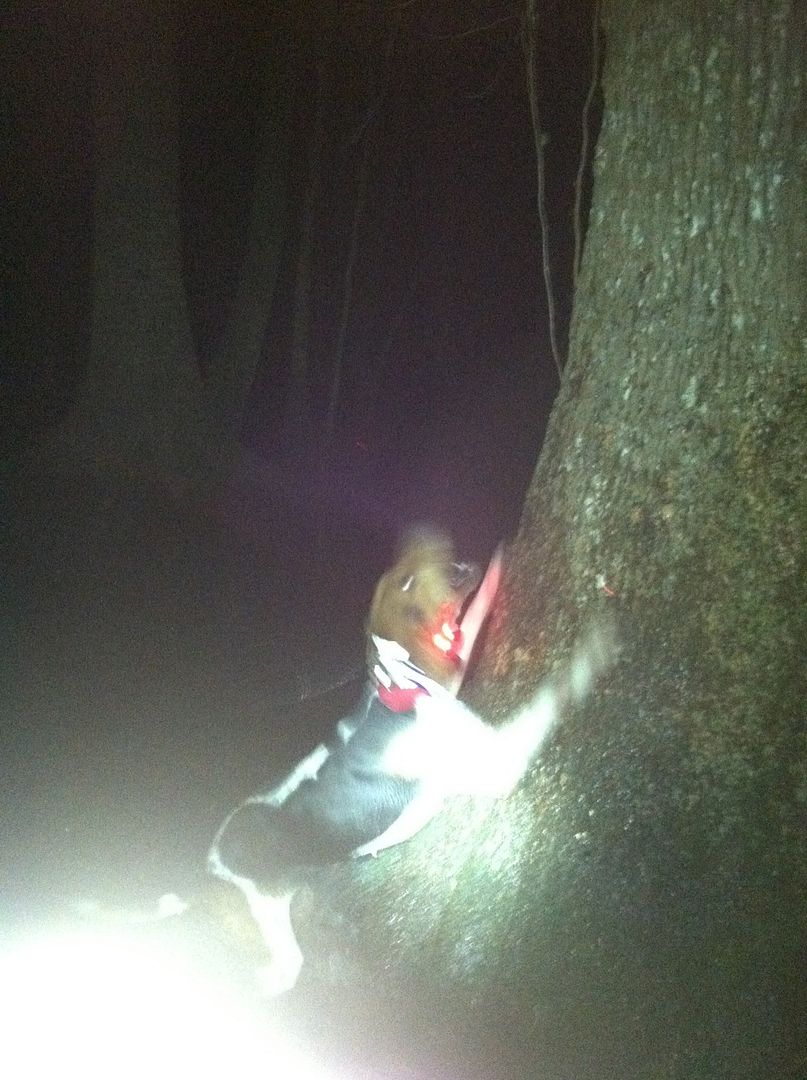 Pepper is red headed and blanket back with a BIG KAHUNA MALE DOG MOUTH that is a BIG Hunting with or without company. She bawls and squalls on the ground and has a very good locate with a screaming squall and chop on the tree. She is accurate and goes hunting by herself on a dead run and Very Independent(80%-90% by herself) She has a good handle and quiet and clean in the kennel. Pepper has been hunted most all of her life by herself up north in thick coons and in deep water swamps in the south. Pepper is about 60 lbs. DOB 8/29/09