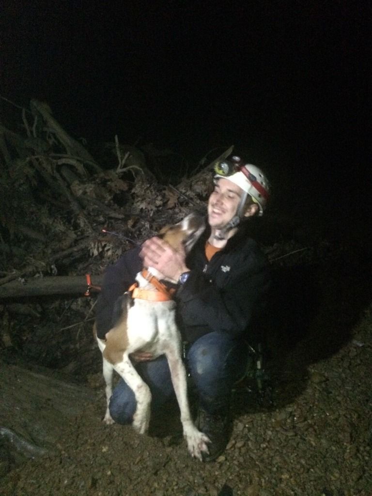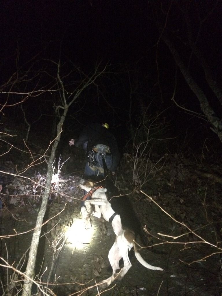 Tuesday night I was hunting near a lake which had some steep hills and some rocky terrain. My young hound got deep in the hills near the lake and became treed. When we arrived at the bottom of the hill we could see he was actually on side of a bluff and he had apparently fallen from the top and then caught himself on a ledge. It was straight up and down above him and below him. I tried to find a way too him but it became obvious he was not going to get down on his own. After a quick call to a friend involved with a local fire department they were able to locate a guy who was able to come and repel from the top and rescue him. I never consider myself as someone who gets attached to my hounds but I guess this one called my bluff.