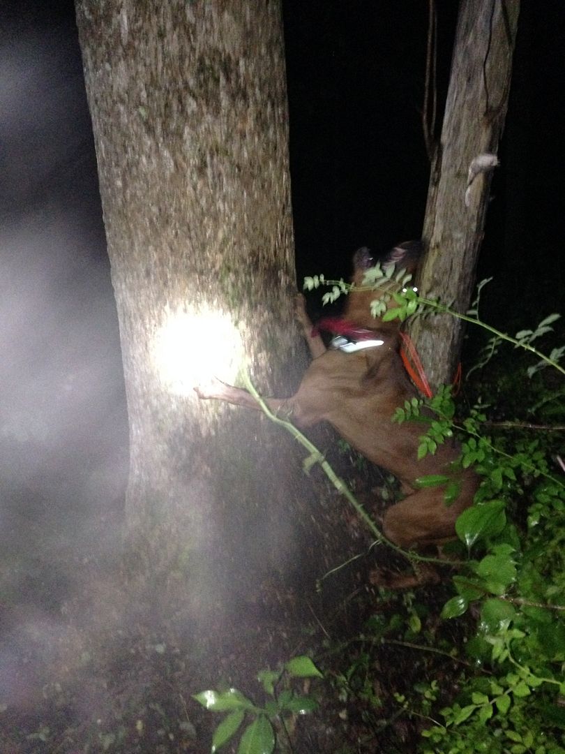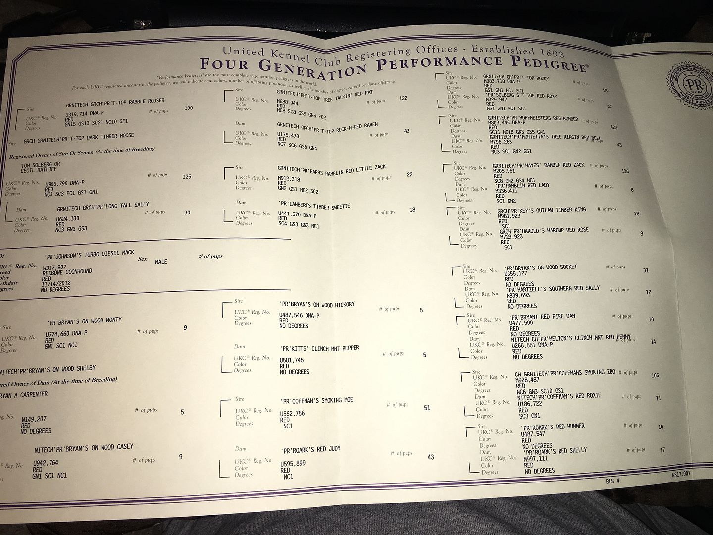Back when I was in high school I coon hunted every night, I mean literally every night that I could possibly go. My buddies and I would hunt til daylight, get home and take a shower, go to school, and do it all over again the next night. I'm not sure how I survived those years but it was some of the best times of my life. Girls, college, and work finally got in the way and I stopped hunting. The last two dogs I had back then were red females and they were COONDOGS. They'd kick dirt up in your face when cut loose and you'd pull them off a tree somewhere. I wish I still had their papers or could remember what they were out of. After being out of the sport for over 20 years, I got back into it back in the spring of this year and naturally I wanted a red dog. I acquired a male dog, pedigree below, and have since hunted every night possible. He just turned 3 and I've treed alot of coons with him. The only complaint I have with him is that occasionally he's a little slow to go hunting when turned loose. Not always, and not that often but I don't like it when he does do it. Never had him make a bark on anything off, handles good, minds good, responds to the tone button like he's on rails, sounds like a freight train on the track and has a loud chop on tree. He's got so much determination on a track/tree that it's almost got him killed a couple times but I would like some suggestions on how or if I can correct the one complaint I have with him. I'm also wanting to find a good red female to add to my kennel and I want one that hits the woods at a dead run when I cut her and wondered what blood lines I should look at? Here's a pic of his pedigree and a pic of him on the tree. Thanks for any tips or suggestions.
