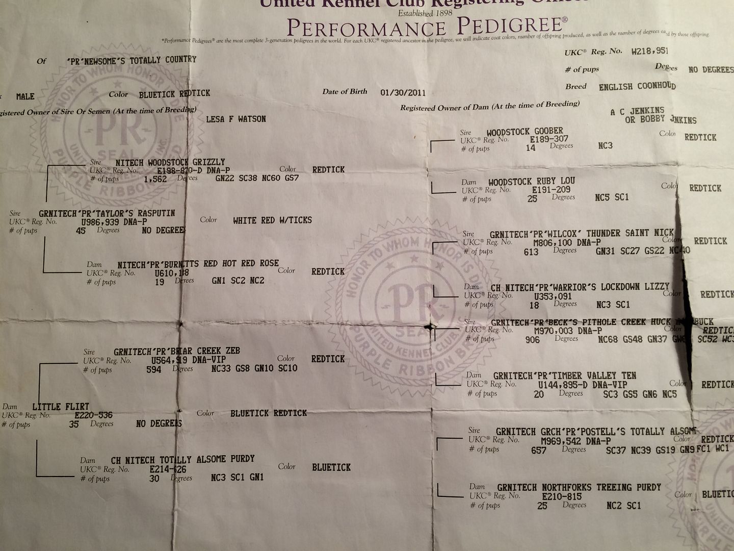 He is a good coon dog, well mannered, and good looking bluetick. I have not owned him all that long, but have hunted with him several times since I bought him. He is a good coondog. He will get deep if needed. Fair mouth, not huge, but loud enough. He will not stand at your feet. He gets up on the wood, stay put tree dog. bawl and chop on track. has a decent handle. I would say he is 60-70% accurate. All around good dog for the price.