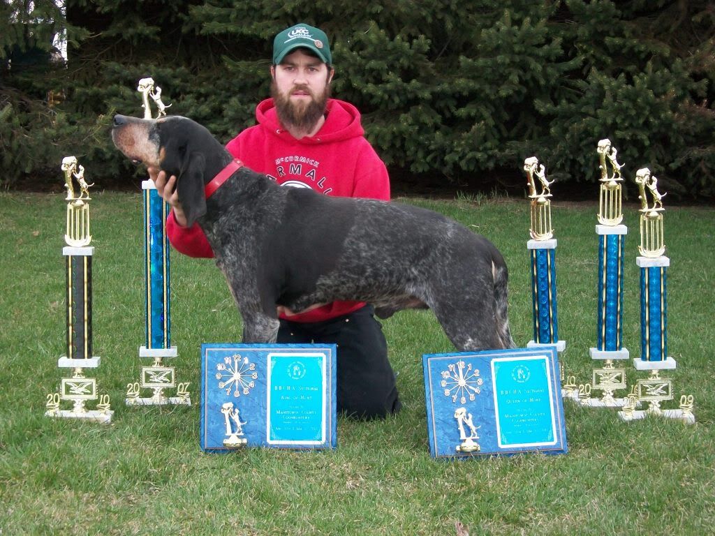 Grnitech Grch Grwch Mad Dog Psyco Talk to em Toby (sire and dam both quad grands, Finished to nitech and BBCHA, BBOA high scoring blue male 2011 Autumn Oaks, 2012 and 2013 Bluetick Days King of Water, 2014 BBOA youth nationals King of Water and Champion male, 2014 Alabama Hall of fame hunt King of Water, 2014 Bluetick Days Blue Hunt 2nd runner up, 3 nite ch wins over 1000 points) owned with Robbie & Lisa Brooks