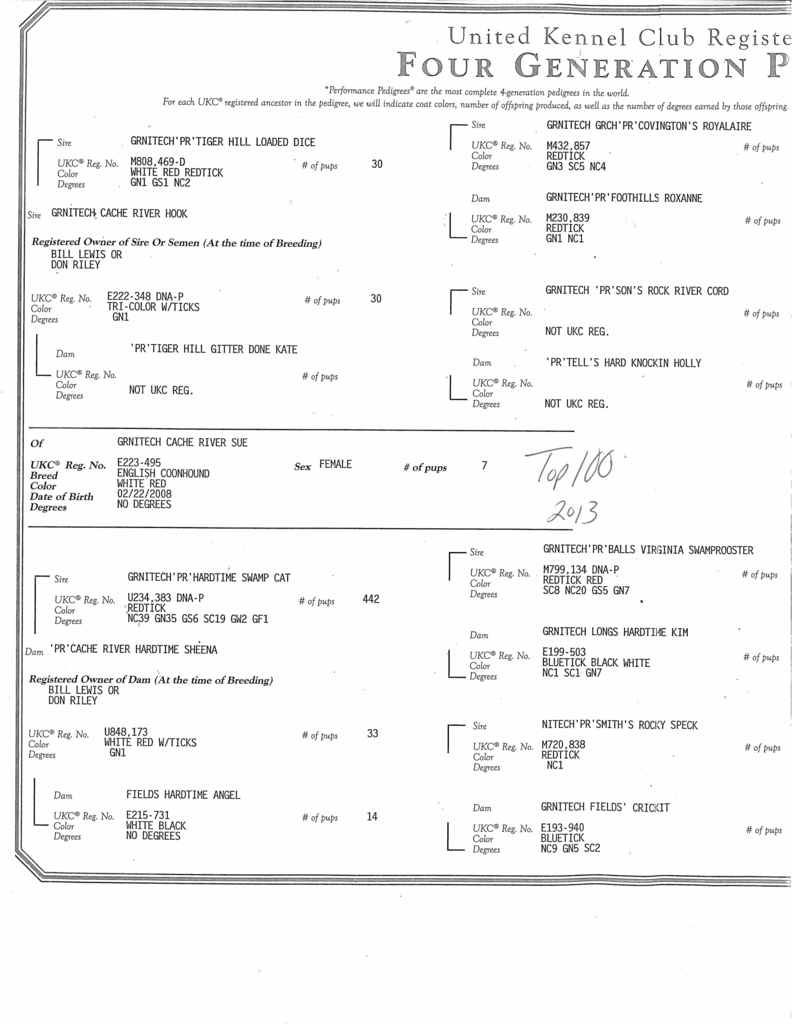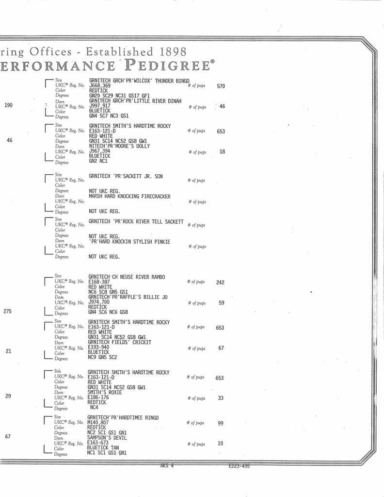 1st off I will start by saying thanks to Asa for trusting in me to partner with him on Thunder as well as a few others over the past few yrs. Asa brought Thunder to me as a young pup, once he was old enough to start carrying to the woods it didn't take long for everything to fall into place. Thunder was quick to start track & Tree, he has a nice all around mouth on him you can hear well. Thunder waits on nothing to go hunting, and has a competitive spirit just like his Momma Ruby, I'd say he is close to her in a lot of ways, and there are things he took from his Daddy as well. I've always enjoyed hunting females more so than males, and Thunder is one of those that will make you proud to own, he is not perfect but I haven't found one yet that is. Asa has done the polishing on him and all the hunts with him, and will continue to do so. Thunder has an impressive pedigree on him, and buy all rights should make a great reproducer. Larry's dogs have always spoken for