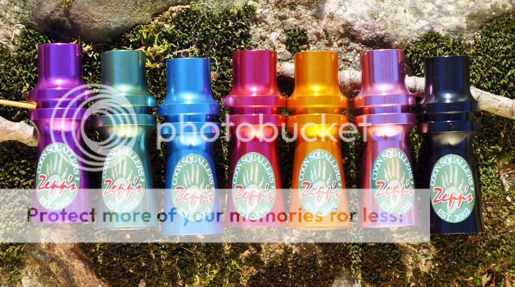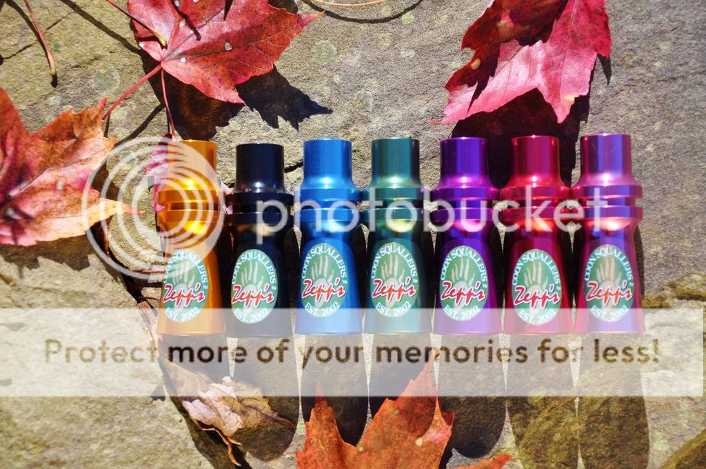 Lots of great colors, the best sound on the market and in the woods. Our Lifetime Coon Squaller is the #1 seller with 1/3 more volume and 3 hand tuned reeds....at the unbelievable price of $25.00! www.MarkZepp.com