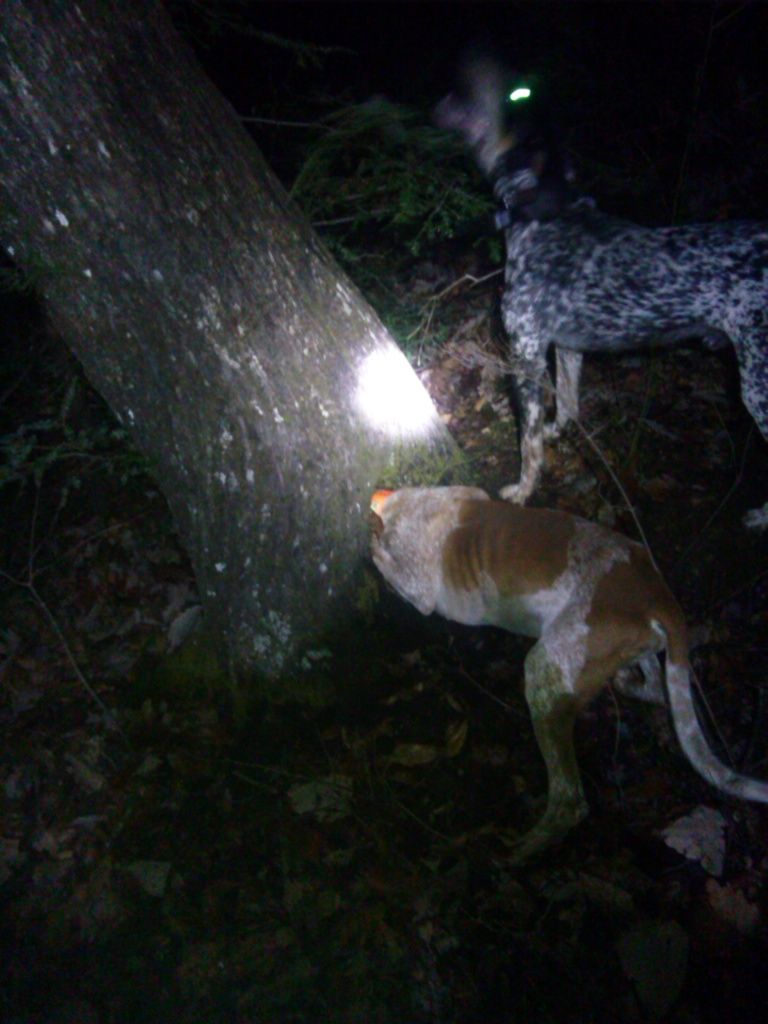 Thursday night about 7pm and Oak and myself are back in the woods. tonight i brought my english pup along with us. this is freds second trip out at night. out of the truck and collared up. planning on walking to the end of this logging road and cutting oak loose. we go about 100 yards and he opens on the lead. cut him loose and off he goes already struck in. goes about 200 yards and there is that locate. no tree bark follows. he must have checked a lil better and he is back on track getting deep. about half a dozen track bawls and he is over 600 yards. looking at the garmin i see where i think they are headed and it aint good for me. looks like another gulf with all the goodies a gulf brings. still working that track but he is getting out of hearing. garmin shows .67, ouch he has to be in the gulf. as im standing there trying to pick my best route, Oak comes treed and he has gotten a tad closer. 973 yards treed. well thats better than 7/10 of a mile he was at. tree barks are faint but i can tell he is telling the world. off me and fred head towards the tree. luckily i find a pretty good old grown up logging road to follow, making the trek a lil easier. about 200 yards out and oak is letting those chops ring, so fred tears off to him. i get there and its an old tree growing out over the side of the gulf. got lucky, not going to the bottom. tree grows up about 15 feet the makes a bend and grows out over the side. as oak is treeing his big ole head off, fred has found the hole at the bottom of this den tree and has his head all the way up to his shoulders crammed in this tree. fred is making it obvious he smells a coon. he is digging on his side and whinning like a baby. he looks stuck. snap a few pictures of oak treeing and some of fred trying his best to get at whatever smells so good to him. remember this is only freds second time out at night. so no coon on the outside again but an obvious den tree and im convinced he is in there. again oak did a bang up job getting struck and working that track as far as he did and as fast as he did. leash him up and get him to some water to cool off cause he has thick slobber all over his head to his tail. he trees hard and tonight hes hot. i really like the way he didnt mind gettin deep and he got deep quick. this dog is going to make one ill talk about yrs from now i think.