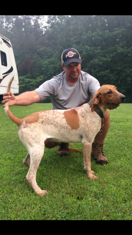 Spot had a great hunt the other night other than the rain. He treed 4 coon in a thunder storm ending up with 750+,no circle, no minus. Would've made him a grand nite but his littermate Goose won the other cast with 775+. Spot is the most consistent cast winner I've ever owned. Not only is he a winner, but his littermates are showing up in the hunts too. Can't wait to see what happens the next couple years with this little hound.