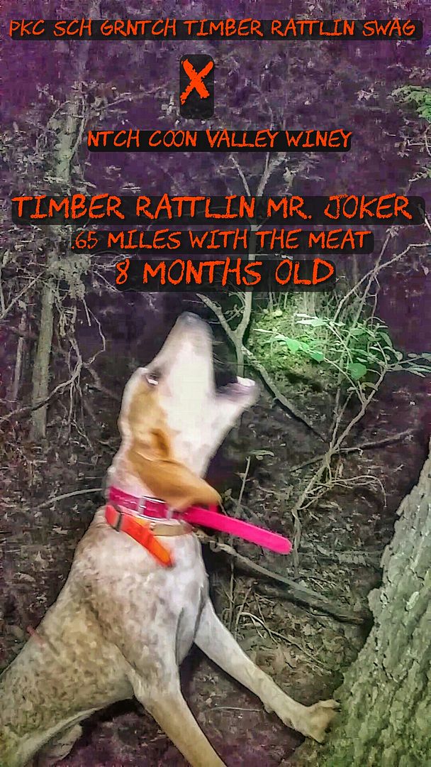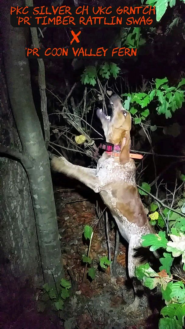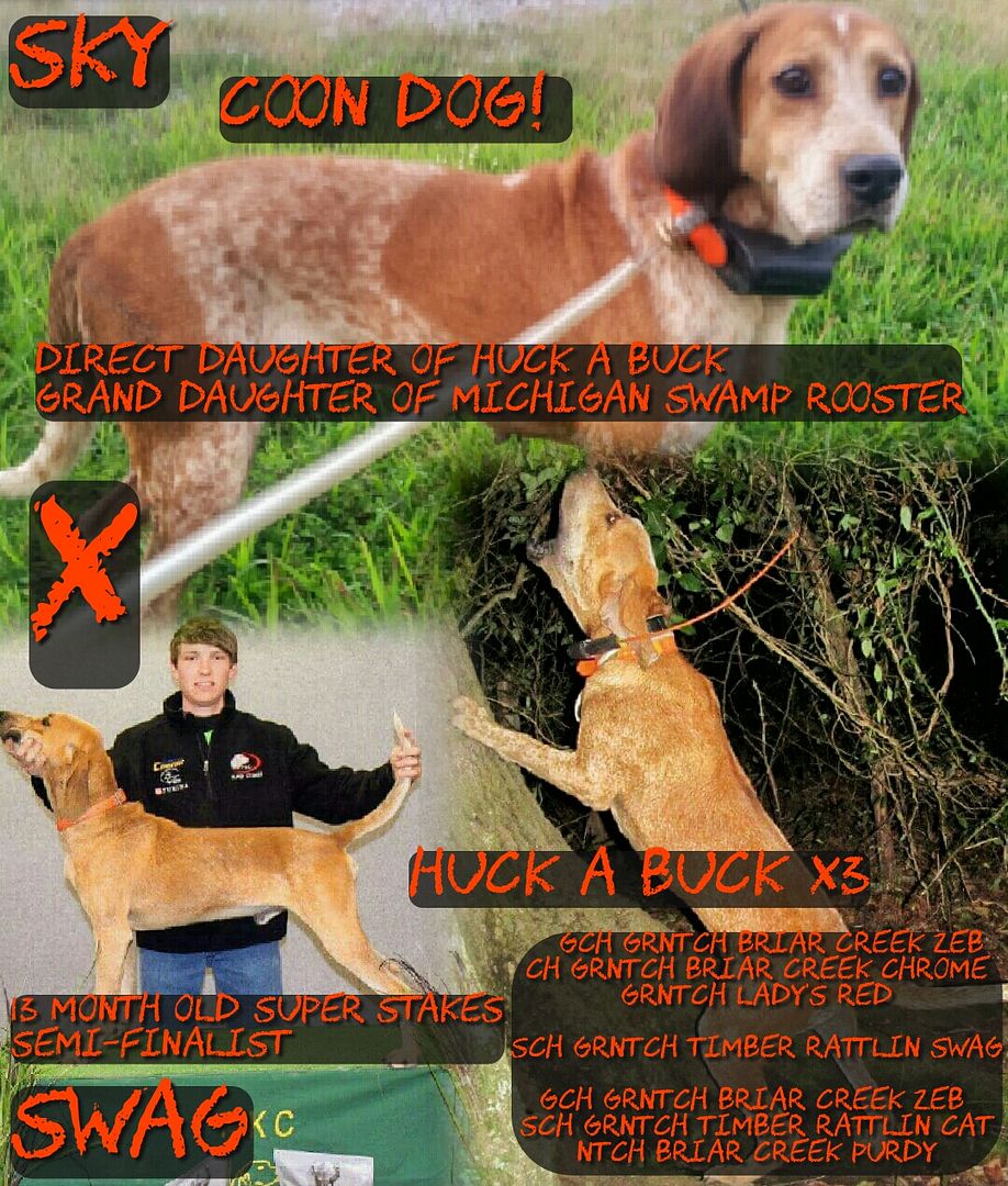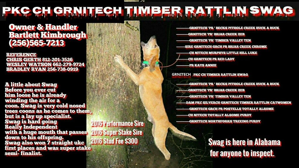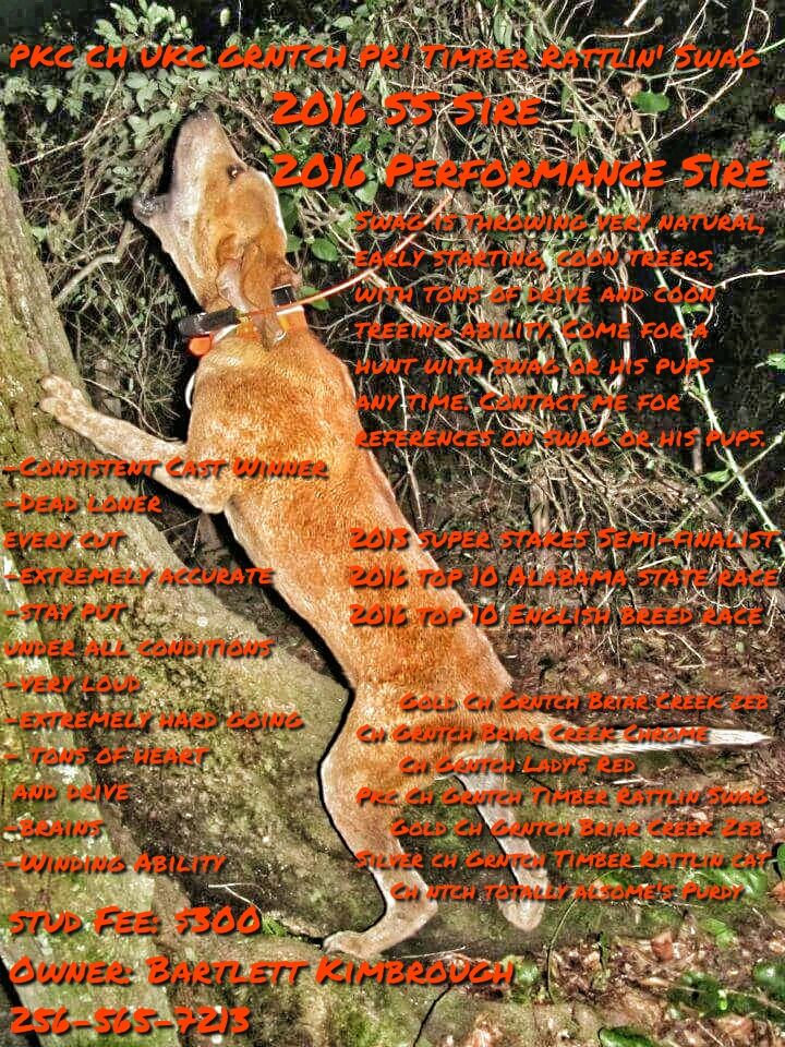 Swag is currently a ss sire and performance sire and will be paid up again in 2017. Swag made GRNTCH with 8 first place wins. He was hunted in the super stakes 1 time and made it to the semi-finals. Swag is just a few dollars short of silver champion and should be by the end of the month. Swag is a coon dog every cut every night any where you cut him loose. He is the most consistent coon dog I've ever walked behind. Big mouth you can hear over a mile easy any time of the year, ton of drive and heart and does not quit no matter what. He goes through the woods with his head up winding and trees a ton of lay up coons that hasn't even been on the ground. He also will grub a bad track up or slam a pop up coon. He trees coons not trees, if he trees you will see a coon. He is currently in the top 10 in the PKC breed and Alabama state race. He is averaging 2 coons an hour in PKC hunts. He is throwing all of his traits in his pups. I have 3 pups out of swag and 3 different females that are 7 to 9 months old that are all running and treeing their own coons. The 7 month old pup could win at the local level now. If you have a nice female and are looking to breed her to a male that is throwing big mouthed pups that start treeing wild coons on their own without encouragement from cage coons, don't over look Swag. Located in North Alabama. Call or text 256-565-7213 stud fee $300