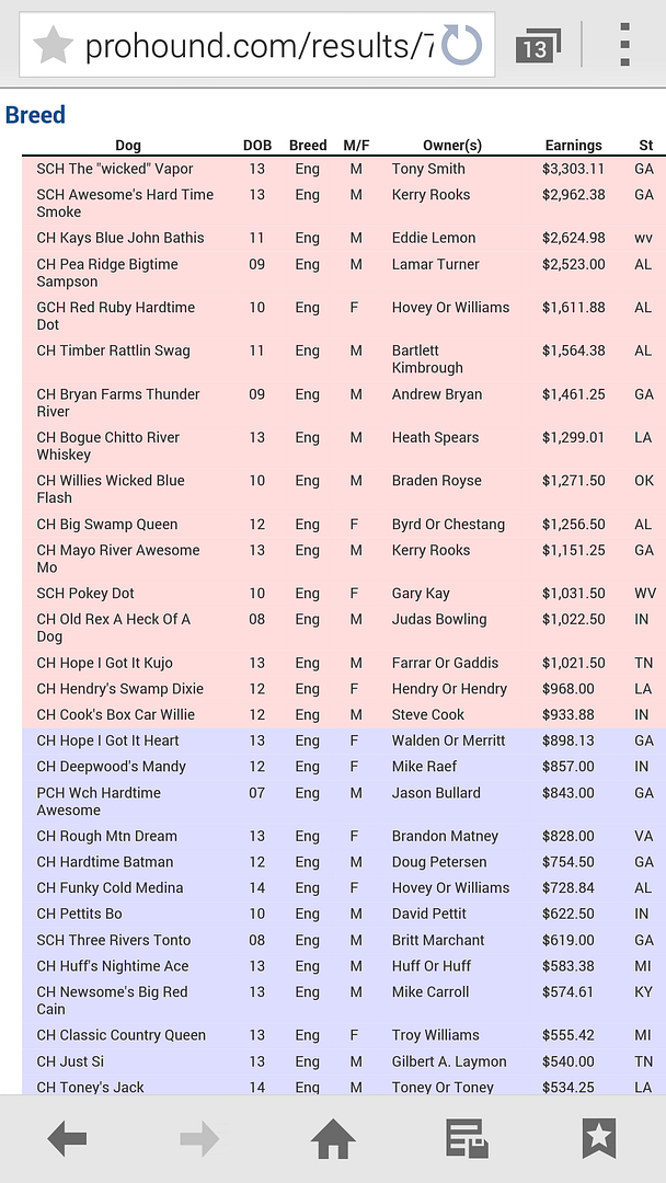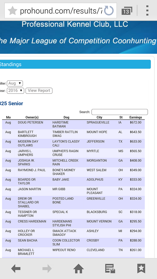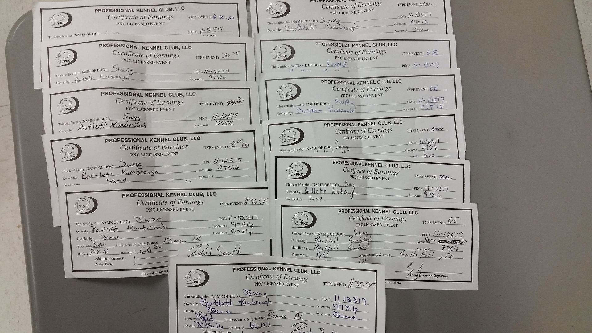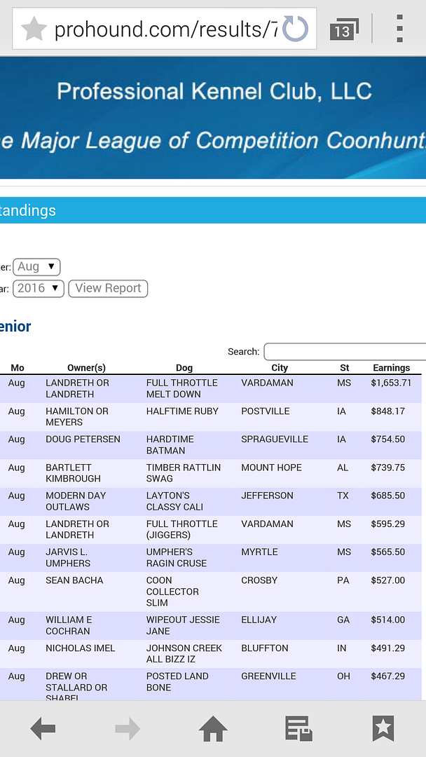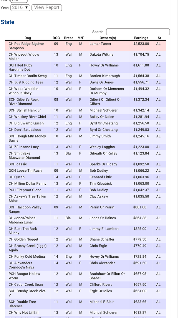 Swag is currently a ss sire and performance sire and will be paid up again in 2017. Swag made GRNTCH with 8 first place wins. He was hunted in the super stakes 1 time and made it to the semi-finals. Swag is just a few dollars short of silver champion and should be by the end of the month. Swag is a coon dog every cut every night any where you cut him loose. He is the most consistent coon dog I've ever walked behind. Big mouth you can hear over a mile easy any time of the year, ton of drive and heart and does not quit no matter what. He goes through the woods with his head up winding and trees a ton of lay up coons that hasn't even been on the ground. He also will grub a bad track up or slam a pop up coon. He trees coons not trees, if he trees you will see a coon. He is currently in the top 10 in the PKC breed and Alabama state race. He is averaging 2 coons an hour in PKC hunts. He is throwing all of his traits in his pups. I have 3 pups out of swag and 3 different females that are 7 to 9 months old that are all running and treeing their own coons. The 7 month old pup could win at the local level now. If you have a nice female and are looking to breed her to a male that is throwing big mouthed pups that start treeing wild coons on their own without encouragement from cage coons, don't over look Swag. Located in North Alabama. Call or text 256-565-7213 stud fee $300