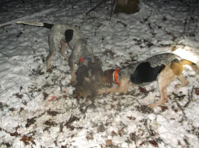 Blue and Ginger treed a bunch last night. Fun hunt treeing 5 coon and ending on a huge oak den.