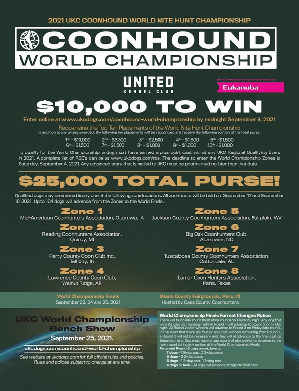 Entries are rolling in daily for the World Championship hunt and show! You can mail your entry receipt in to enter OR go online and do an online entry. https://www.ukcdogs.com/coonhound-world-championship